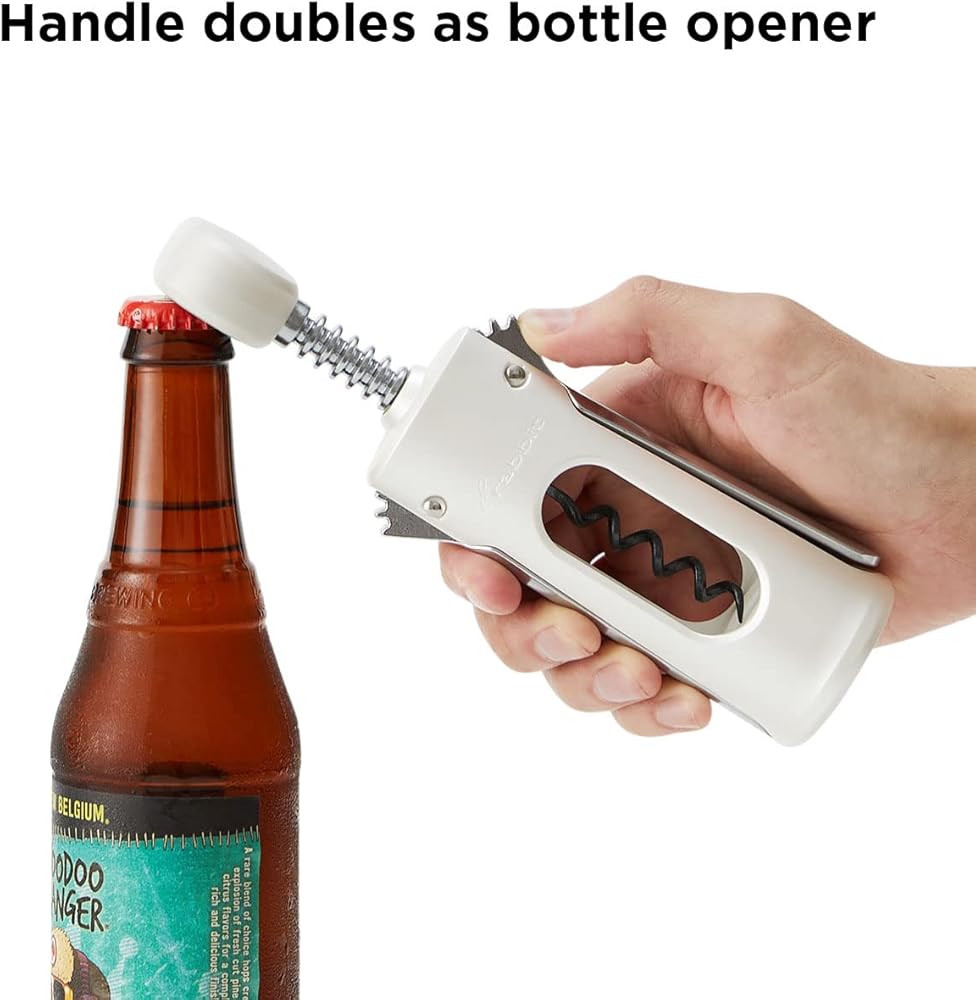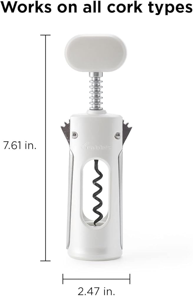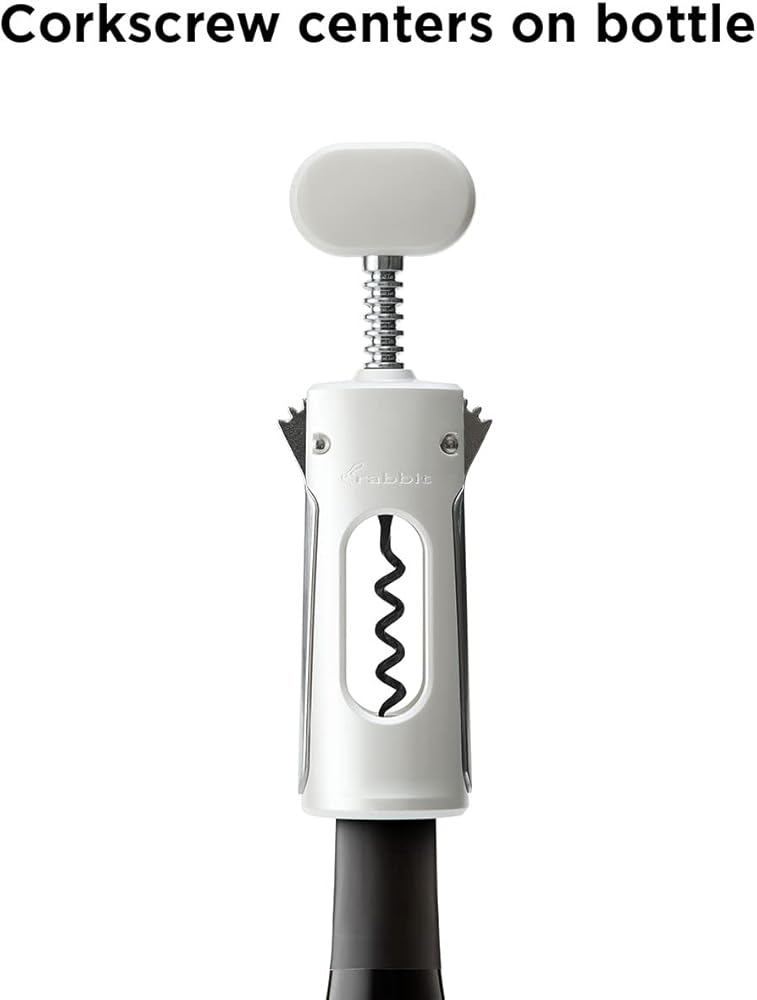 The Rabbit Wing Corkscrew is a two-in-one tool that makes opening wine or beer bottles a breeze. It fits easily on top of most wine bottles and centers itself over the cork with no extra effort. While twisting the handle you can see the spiral as it progresses into the cork. The wings rise up and provide leverage for a satisfying wine opening experience.