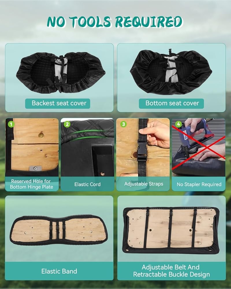 [سهل التركيب] - لا يتطلب غطاء مقعد عربة الجولف الخاص بنا أي دبابيس، كما أن الحزام القابل للتعديل وتصميم الإبزيم القابل للسحب يساعدنا على تركيبه بسهولة في دقائق، وهو ثابت للغاية وليس من السهل تغييره.