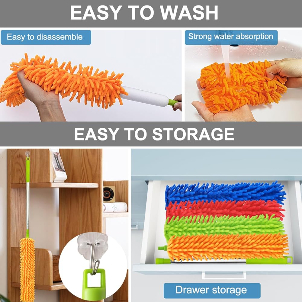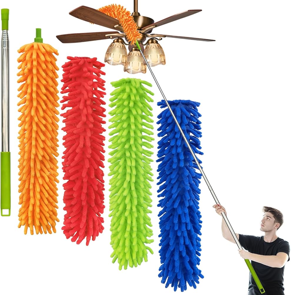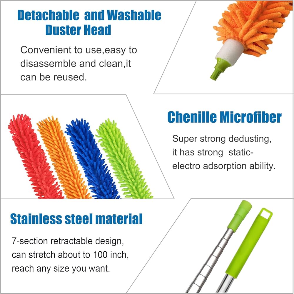 4 قطع من منفضة الريش المصنوعة من الألياف الدقيقة، عمود قابل للتمديد من 76.2 سم إلى 100 سم، رأس منفضة شانيل قابل للفصل والطي والغسل، أداة تنظيف للمكتب والسيارة والنوافذ والأثاث ومروحة السقف