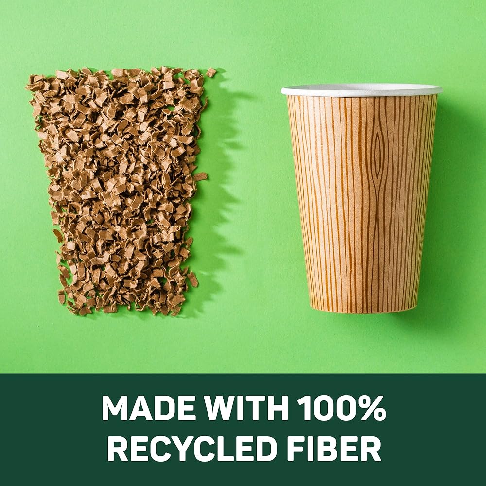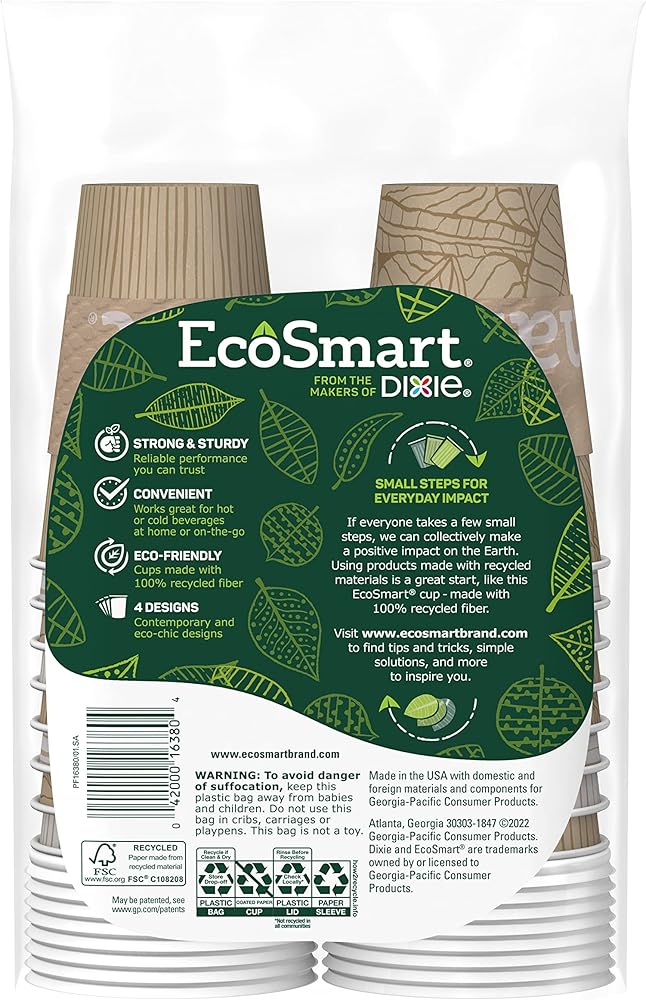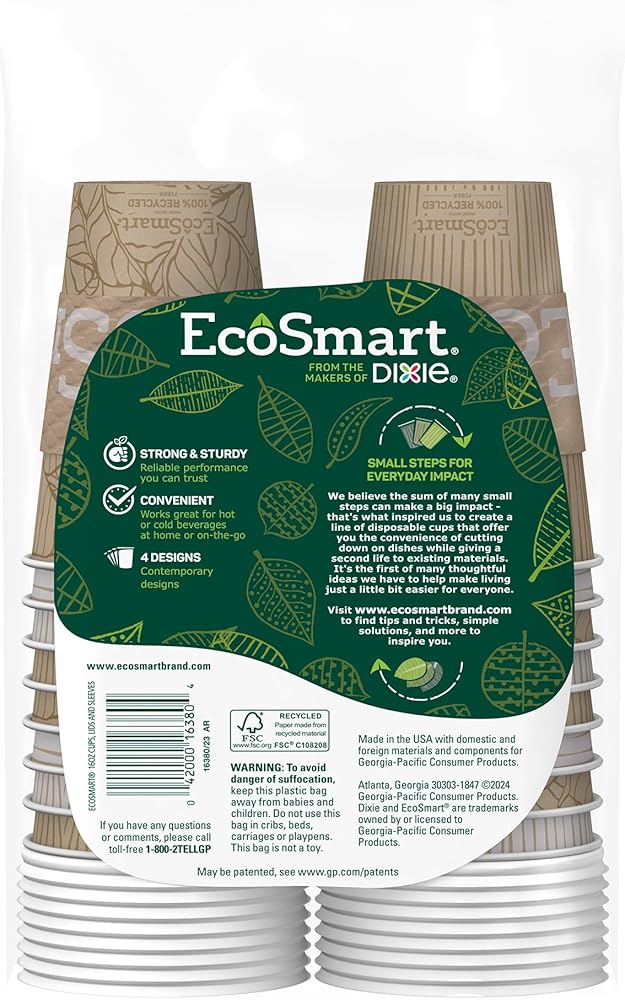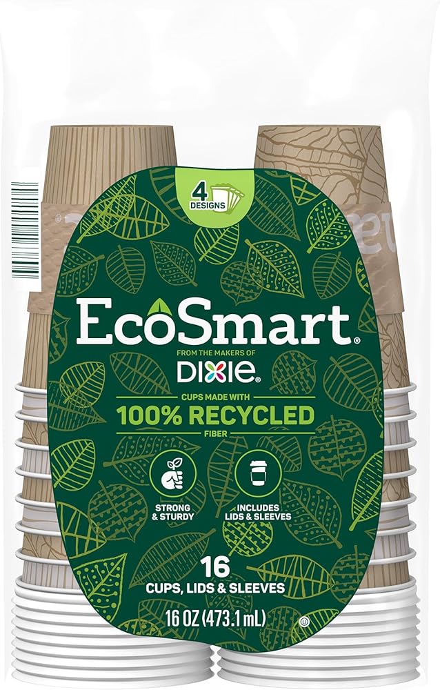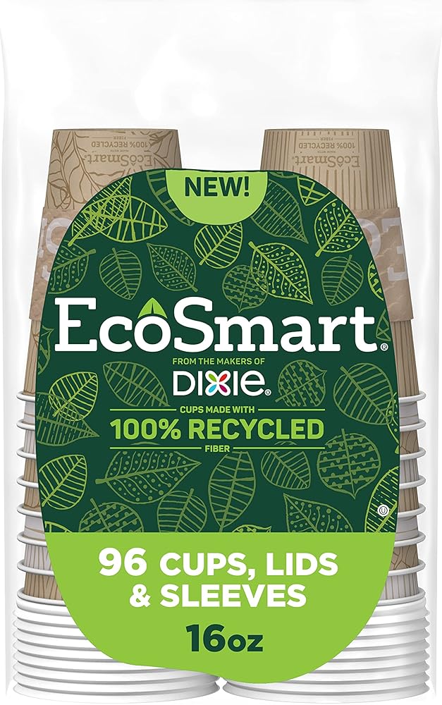 Introducing EcoSmart® paper cups from the makers of Dixie®. Our 16 oz. disposable coffee cups are made with 100% recycled fiber that gives a second life to existing resources—like used cardboard boxes! With EcoSmart®, shopping for sustainable cups is simple and affordable so you can drink on the go with confidence. Our combo pack of paper cups come with sleeves for on-the-go drinks.