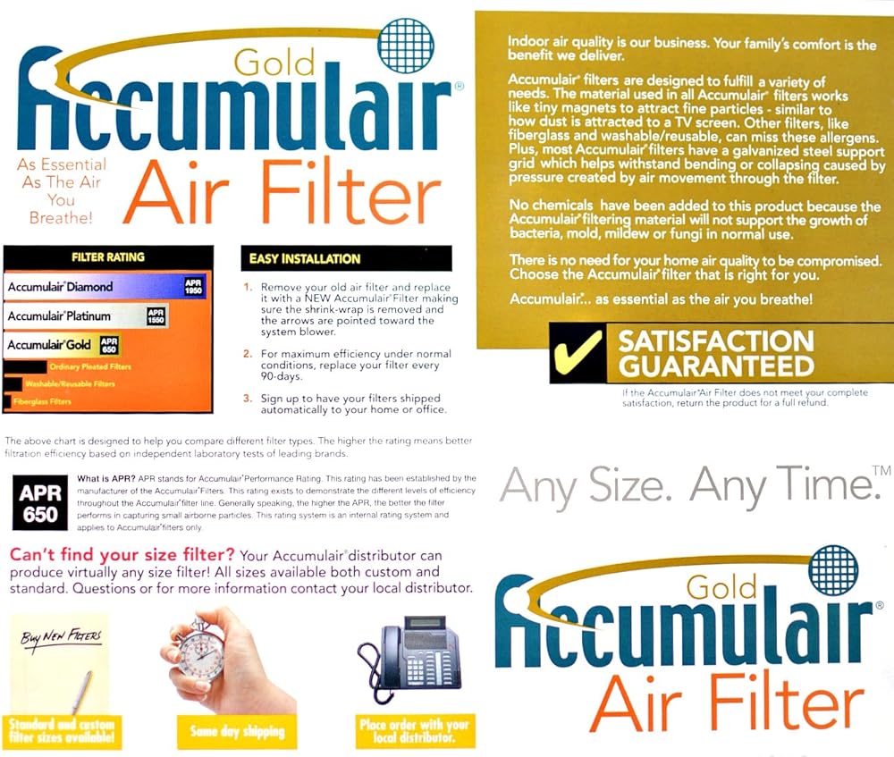 The Accumulair Gold 10x14x1 air filter is designed to provide high-efficiency filtration with a low resistance to airflow. The 100% synthetic media is designed to capture small airborne particles that containment your indoor air. To increase durability, the pleated media is laminated to a metal backing that is recyclable, galvanized, and corrosion-resistant. The filter contains media that has been tested to perform at the Minimum Efficiency Reporting Value of 8 (MERV 8) by an independent lab according to ASHRAE Standard 52.2. The filter is equipped to enhance air quality by capturing up to 76% of common airborne particles such as dust, lint, dust mite debris, cement dust, standing dust, small fibers, and other airborne contaminants. All MERV data and statements are indicative of typical properties and characteristics obtainable. MERV claims are to be used as a guide for general comparison and not as a specification.
