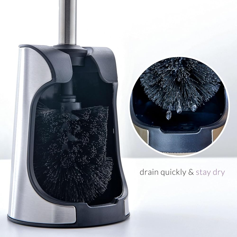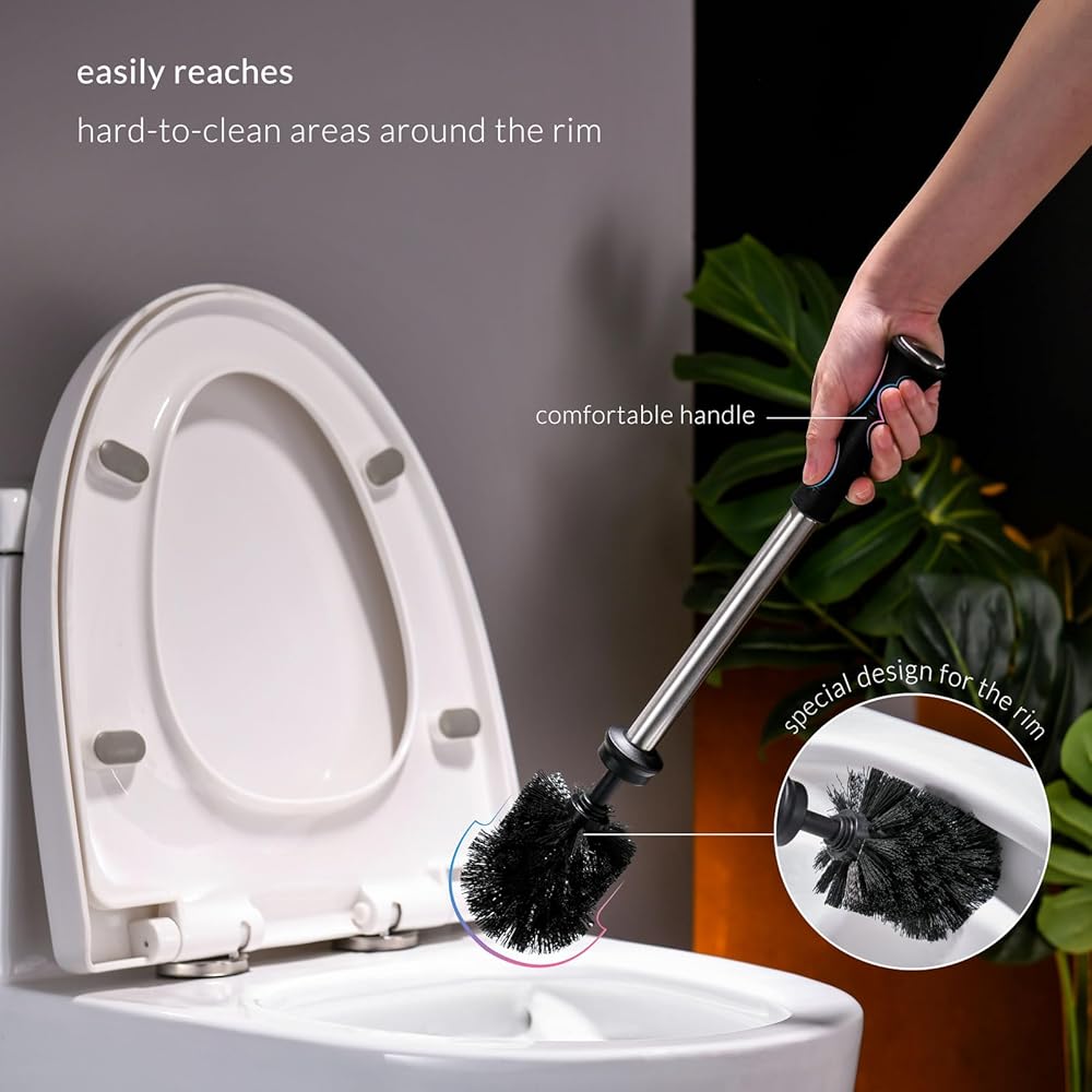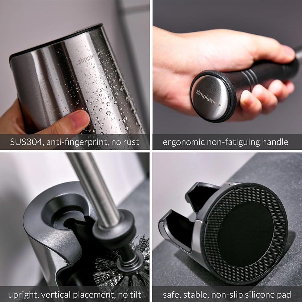 شعيرات تنظيف أكثر فعالية للمراحيض: بعد مئات الاختبارات التي أجراها سيمبليتوم، تتمتع شعيرات النايلون الصلبة بأداء تنظيف أكثر كفاءة من شعيرات السيليكون الناعمة، خاصة للمراحيض ذات الحجم الكبير. الشعيرات الخارجية الصلبة مثالية لتنظيف البقع الصعبة. يمكن لرأس الفرشاة الموسع المصمم خصيصًا الوصول بسهولة إلى المناطق التي يصعب تنظيفها حول الحافة.