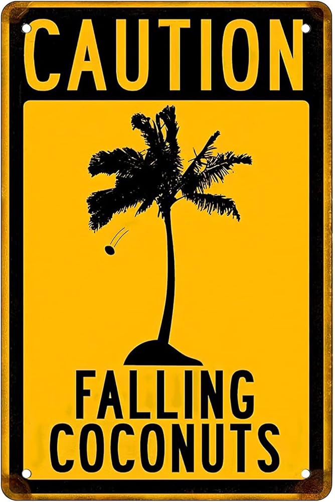 تحذير من سقوط جوز الهند، لافتات معدنية مضحكة قديمة، تزيين الحائط، مقاس 8 × 12
