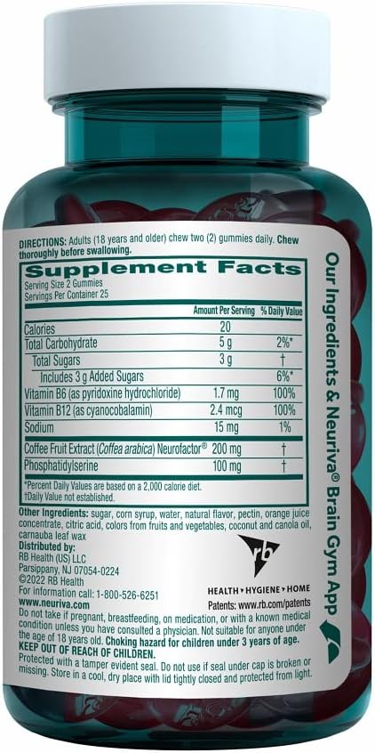 NOOTROPIC BRAIN HEALTH SUPPORT GUMMIES: Clinical studies have shown that coffee cherry (Neurofactor) and plant-sourced Phosphatidylserine have a positive effect on brain health. BRAIN HEALTH SUPPORT: Clinically tested Neurofactor helps support focus, concentration & accuracy, while clinically tested Plant-Sourced Phosphatidylserine helps fuel memory & learning.* With B Vitamins to help support cognitive function. CLINICALLY TESTED NEUROFACTOR: This whole fruit extract has been Clinically tested & shown to increase levels of the vital neuroprotein BDNF* (brain-derived neurotrophic factor). BDNF is known to support connections between brain cells. HOW TO ENJOY: Adults (18 years and older), chew two (2) gummies daily. Chew thoroughly before swallowing. GREAT TASTE, TRUSTWORTHY INGREDIENTS: These delicious Strawberry flavor brain support gummies were formulated with you in mind, so they are Vegetarian, Gluten-Free, Naturally Flavored and Decaffeinated. GET DIGITAL WITH NEURIVA APP: Get Braining! Download our NEURIVA BRAIN GYM app from the App Store or Google Play to start assessing your skills and building your brain fitness routine. PEACE OF MIND: Neuriva Brain Support Supplements, like all Schiff products, are guaranteed for freshness, purity, and labeled potency. *These statements have not been evaluated by the Food and Drug Administration. This product is not intended to diagnose, treat, cure or prevent any disease.