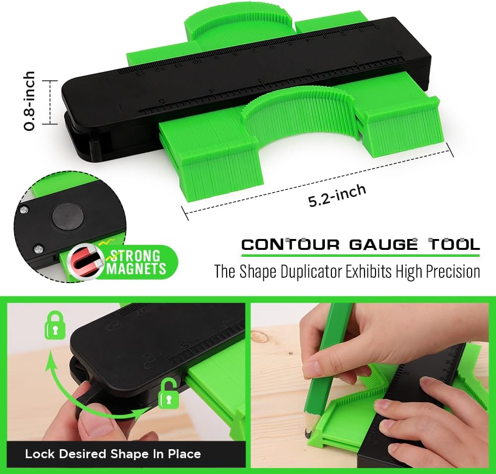 The duplicator gauge with lock helps making accurate copies of curved corners, tight trim angles and round edges.