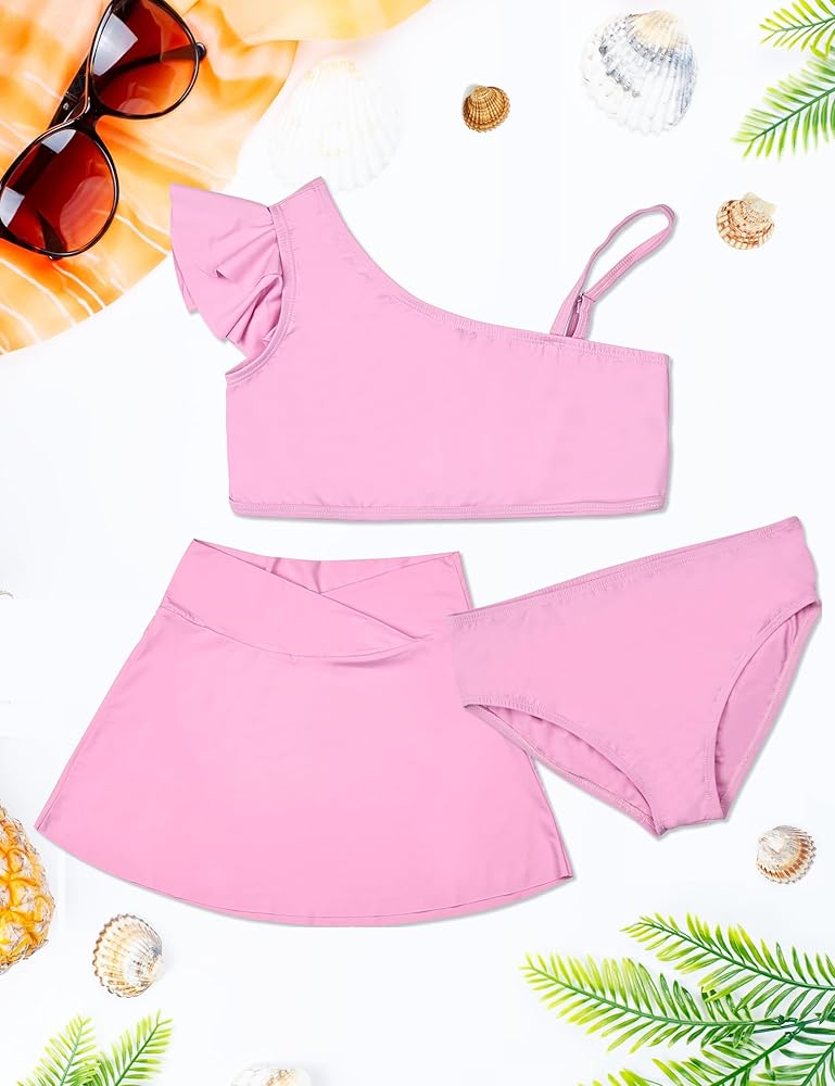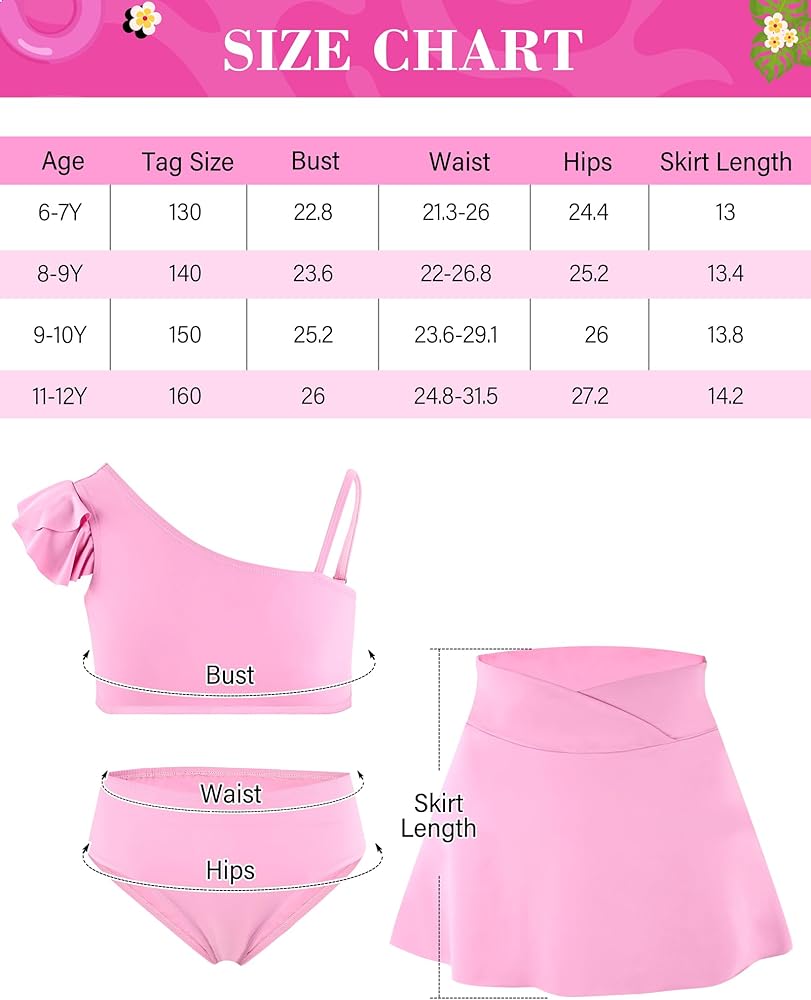 تشتمل العبوة على: مجموعة البكيني المكونة من 3 قطع للفتيات تتضمن قطعة علوية للسباحة مكشكشة، وقطعة سفلية للسباحة، وتنورة متقاطعة الخصر. استعدي لمتعة الصيف مع ملابس الشاطئ الرائعة للفتيات!