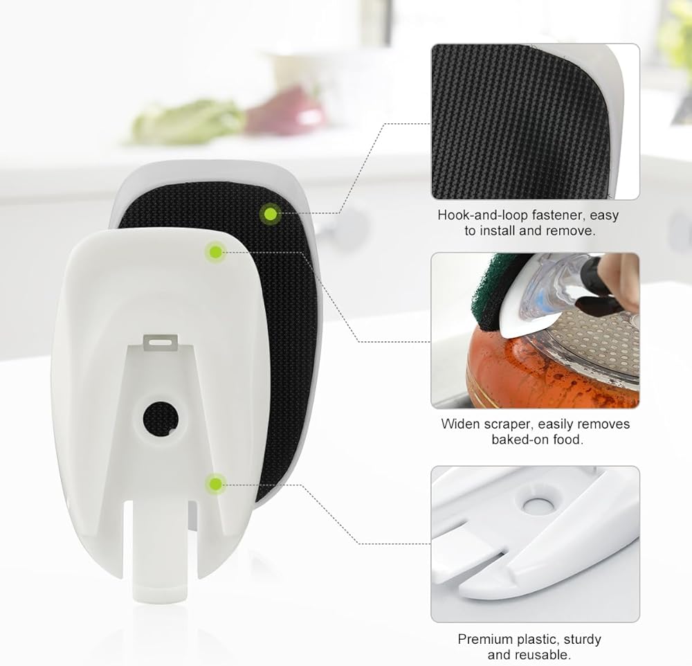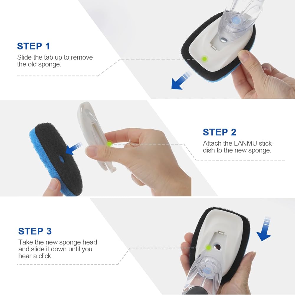 سهل الاستخدام: 1. قم بتحريك العروة لأعلى لإزالة الإسفنجة القديمة. 2. قم بتوصيل طبق LANMU القابل لإعادة الاستخدام بالإسفنجة الجديدة. 3. خذ رأس الإسفنج الجديد وقم بتحريكه لأسفل حتى تسمع صوت نقرة. مكشطة على الجانب الخلفي من الإسفنجة، تزيل الطعام المخبوز بسهولة.