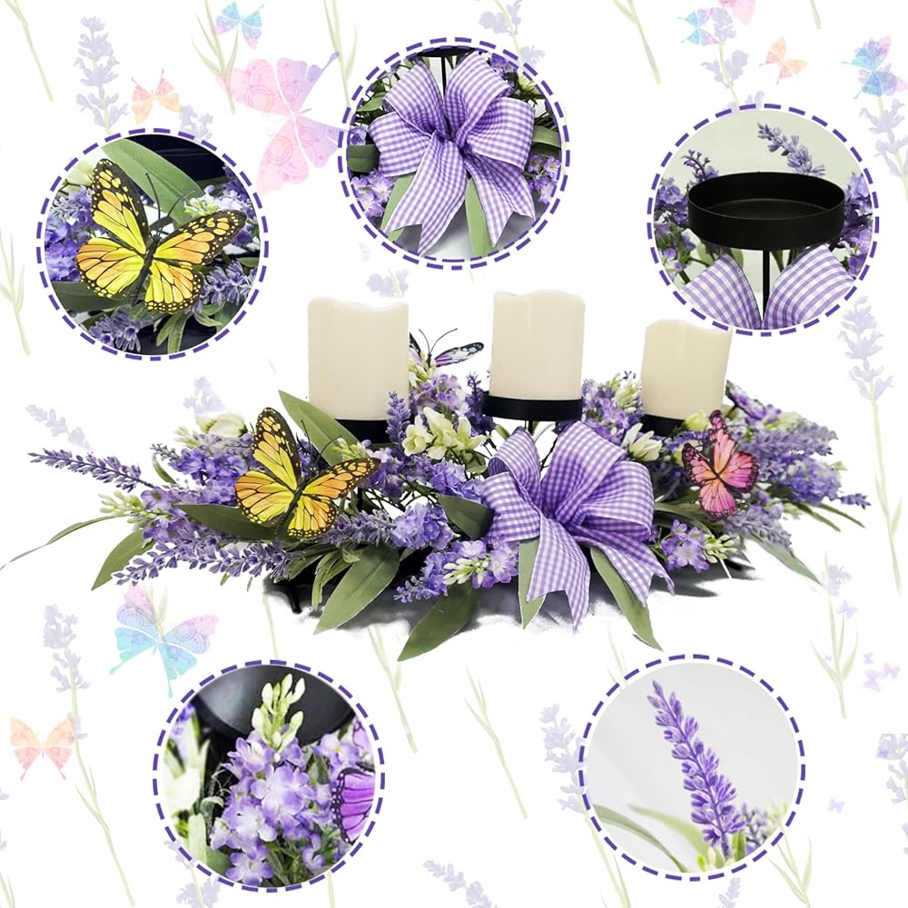 جمال هادئ: اخلق جوًا هادئًا في حفلتك المنزلية القادمة مع حاملات الشموع الرائعة هذه. تثير زهور اللافندر الاصطناعية النابضة بالحياة والأوراق الخضراء والزهور البيضاء الرقيقة والفراشات الغريبة إحساسًا بالهدوء. القطعة المركزية مزينة بقوس فراشة من القماش القطني الأرجواني الساحر، مما يضيف لمسة غريبة إلى ديكورات رف منزلك الداخلي.