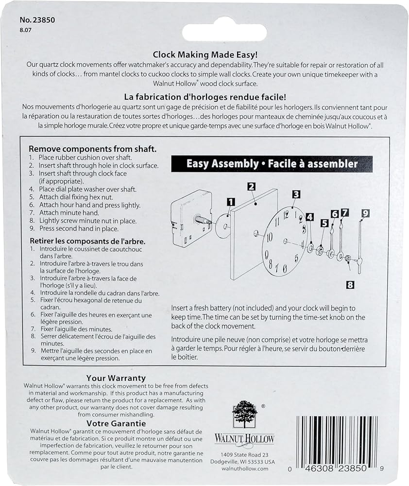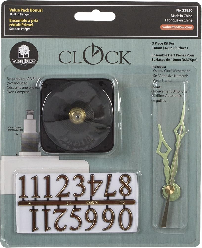 This set of gold-finished clock-making components offers makers and hobbyists accuracy and dependability. Suitable for making, repairing, and restoring all kinds of analog clocks, from simple wall designs to cuckoos. Create your own unique timepiece when purchased with a Walnut Hollow wood clock surface (not included). For this kit, your wood surface must be 3/8'-thick to accomodate the clock motor's 5/16" shaft diameter, 1/2" threaded shaft length, and 11/16" overall shaft length. Package contains one quartz clock assembly with three hands and 27/32" self-adhesive numbers. The minute hand is approximately 2.7" (68.5mm) and the hour hand is 2" (50.8mm). Requires one AA battery (not included).