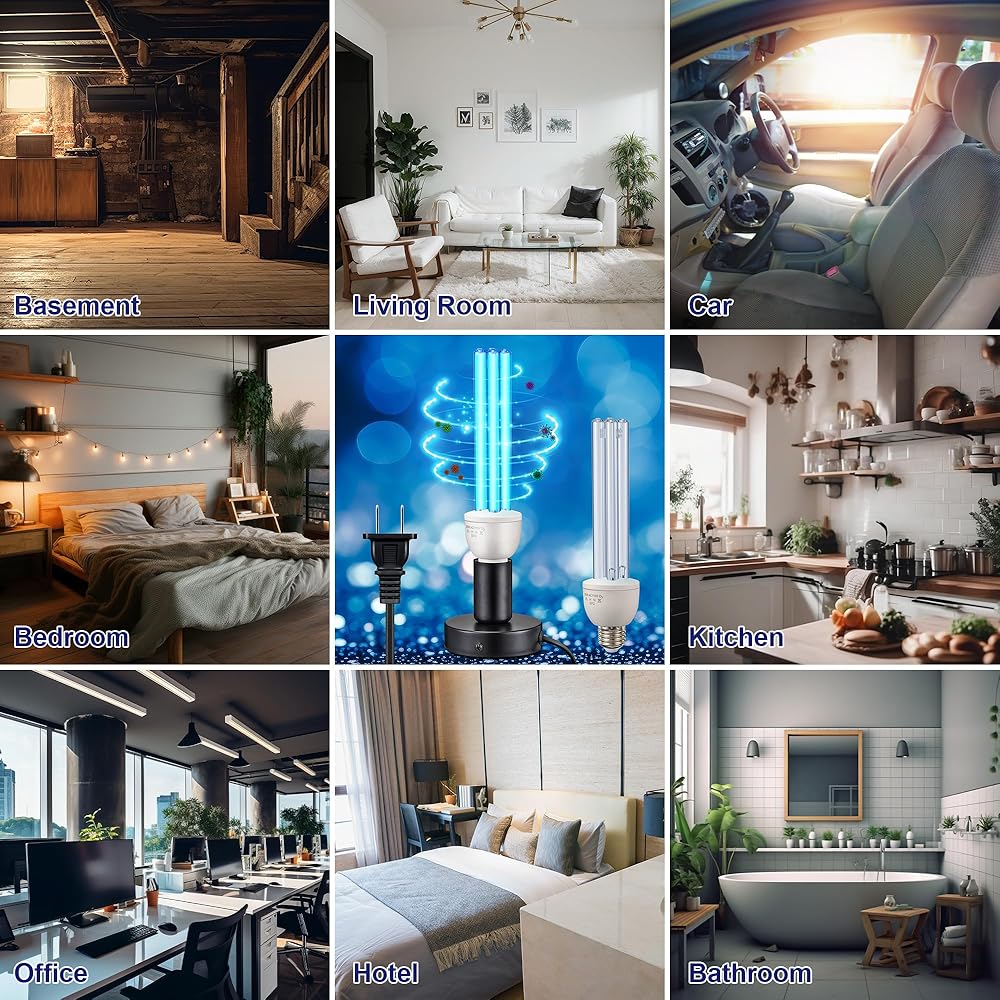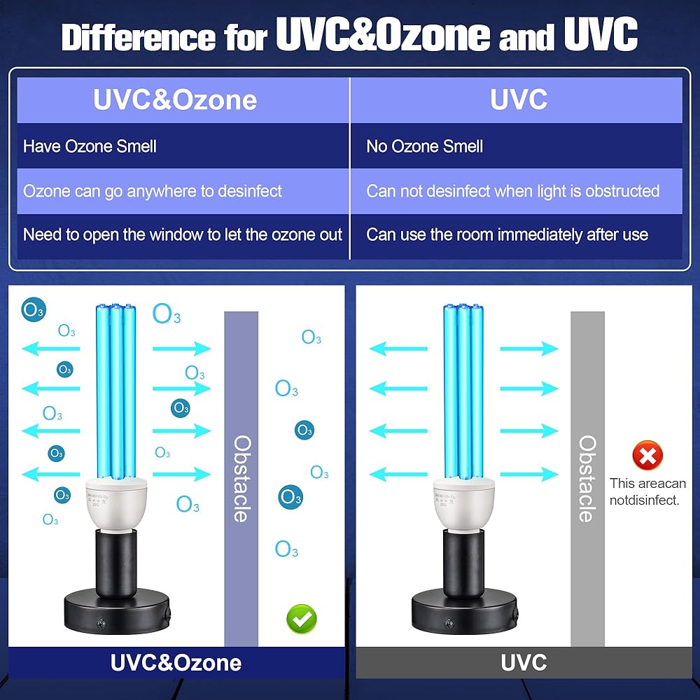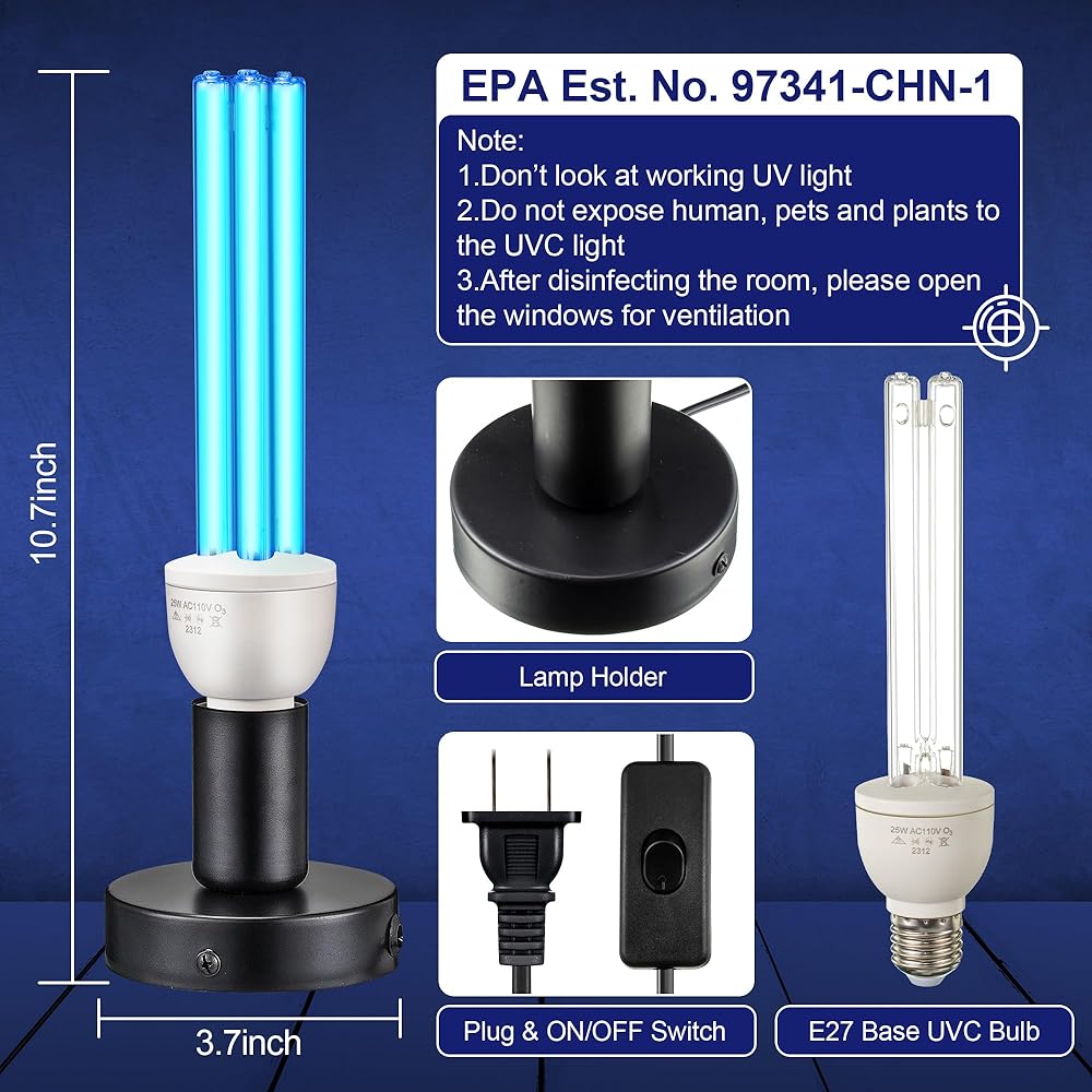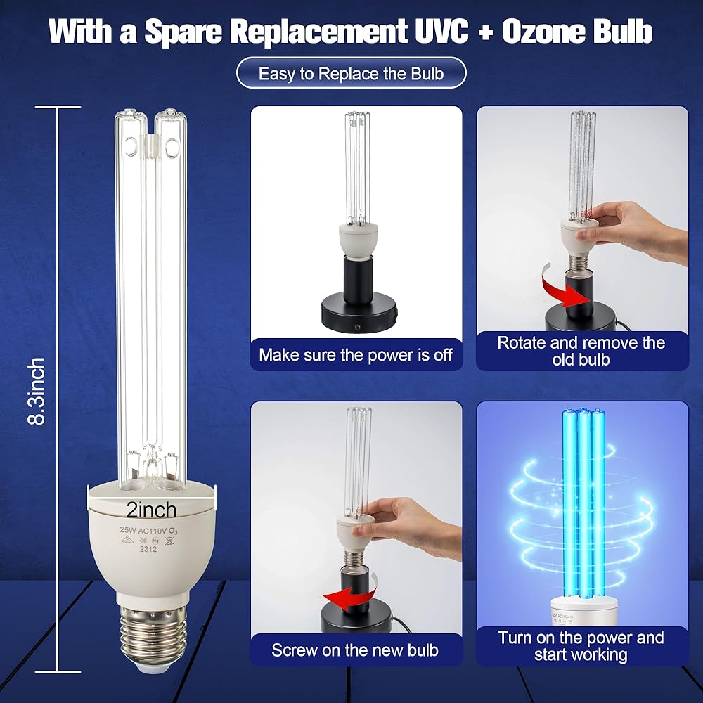 With a Spare Replacement Ozone Bulb: the UV lamp features a convenient replacement UVC bulb, allowing users to easily replace the bulb and extend the product's lifespan; Additionally, the lamp has a safety switch design to ensure users are not exposed to ultraviolet radiation when changing the bulb