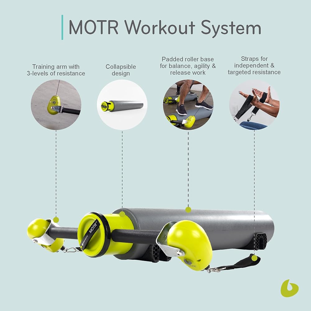 • COMPLETE GYM SET FOR HOME & MORE: The MOTR has a sturdy padded roller-tube base that holds 2 arms with 2 variable resistance modules. This studio and home-gym system features 2 stability wedges, a self-locking lid, pull straps, and 2 universal handle straps.