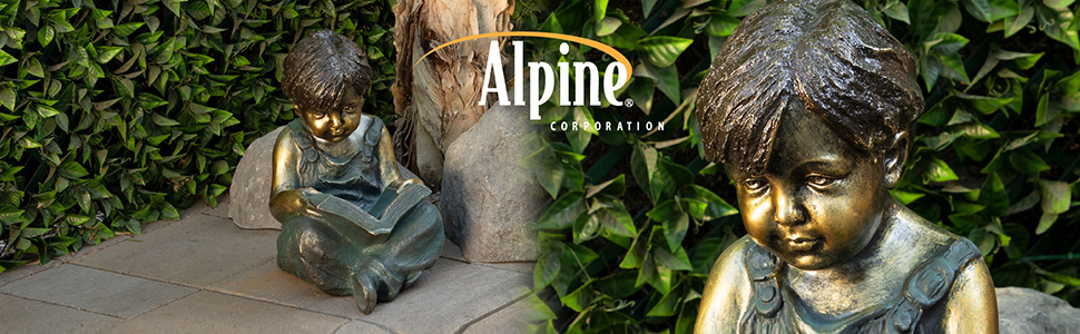 Add a touch of childish whimsy to your outdoor space with the Alpine Corporation Boy Sitting Down Reading Book Statue. This stunning statue is constructed of durable magnesium oxide with an antique bronze and patina finish to suit any outdoor space. The statue is weather-proof, rust-resistant, and durable for years of quality use. With an antique-look, intricate details and portrayal of a timeless child, this Alpine statue is sure to bring peace and tranquility to your home! The statue is perfect for your garden, patio, deck, porch, or yard space. With a 1-year warranty, you can be confident in the quality of your purchase. Statue measures 18"W x 13"L x 19"H for use in yards of any size. Alpine Corporation is one of America's leading designers, importers, and distributors of superior quality home and garden decor products. Alpine's award winning in-house design team continuously develops new and innovative "statements pieces" for your home and garden. Your outdoor living spaces will be the envy of the neighborhood with our wide assortment of fresh, fashionable and contemporary products, from beautifully crafted solar garden stakes featuring patented motion and fiber optic lighting technology to gorgeous glass and glow-in-the-dark bird baths and feeders.
