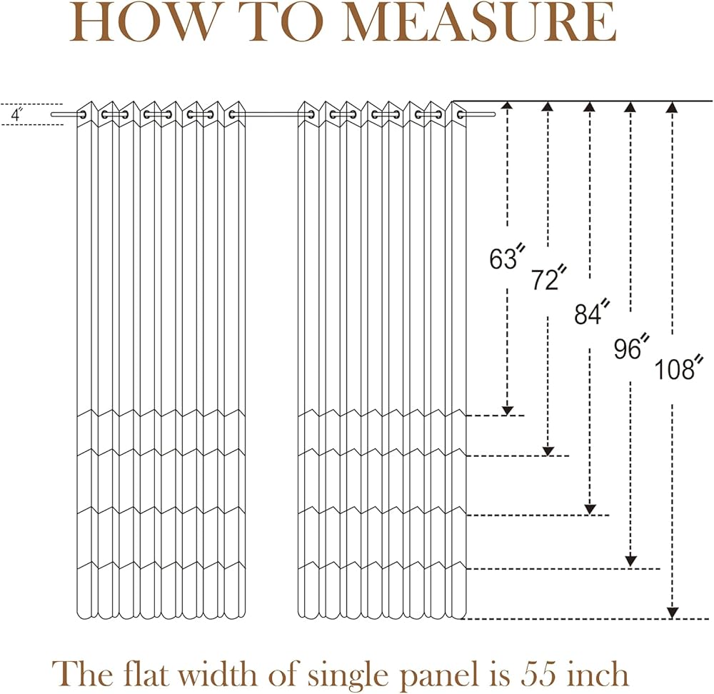 العبوة: مجموعة من لوحتين. طريقة القياس لكل لوحة كما هو موضح في الصور: العرض 55 بوصة، الطول الموضح هو طول القماش أسفل جيب القضيب الأول، 63 بوصة، 72 بوصة، 84 بوصة، 96 بوصة، 108 بوصة متوفرة . يتم وضع جيب القضيب الأول بشكل مسطح على ارتفاع حوالي 1.5 بوصة (3.8 سم).