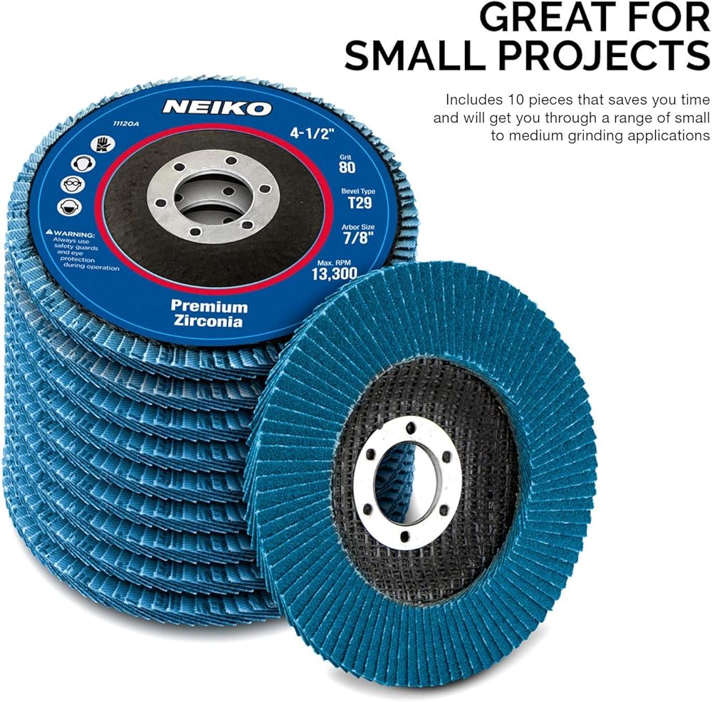 NEIKO 11120A 10 أقراص زركونيا رفرف 4-1/2 لمطحنة الزوايا، عجلة فلابر 80 حبيبة، عجلة طحن T29 بزاوية 4.5 بوصة، قرص طحن أربور 7/8 بوصة (عبوة من 180)
