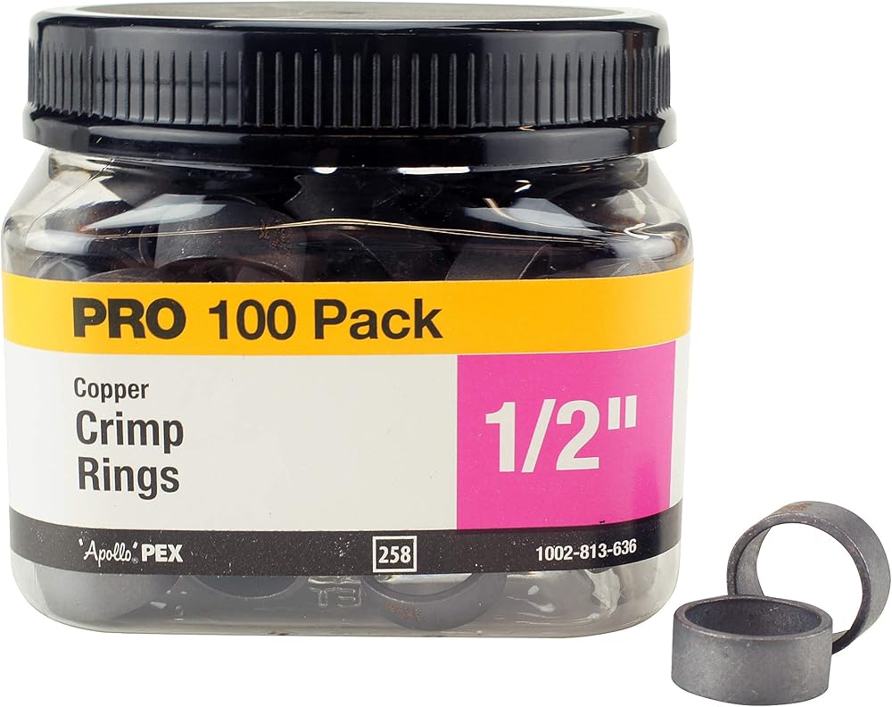 The ApolloPEX 1/2 in. Copper Crimp Ring (100-Pack) is simple to install and is designed for use with PEX pipe and barb fittings (not included). Made from copper for durability. Requires a crimping tool (sold separately). ApolloPEX fasteners are a key component of the most economical potable water piping systems. Also capable of integration into hydronic heating systems, ApolloPEX fasteners can be can be used with brass and plastic fittings, valves, and manifolds (all sold separately). The ApolloPEX system is a comprehensive piping system comprised of brass fittings, poly alloy fittings, manifolds, valves, fasteners, tools and tubing designed for implementation in water delivery systems, simple or complex.