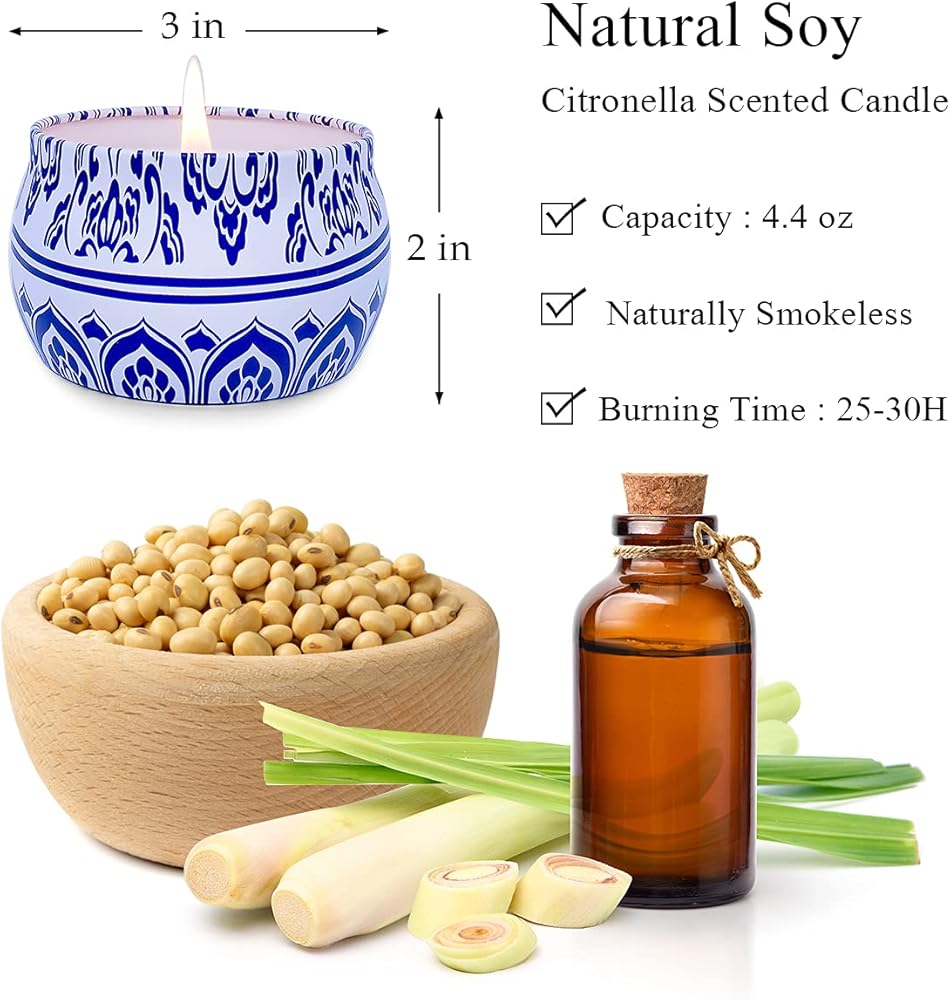• 100% Soy Wax and Smokeless: These citronella outdoor candles are made with naturally biodegradable and eco-friendly pure soy wax and citronella oil.