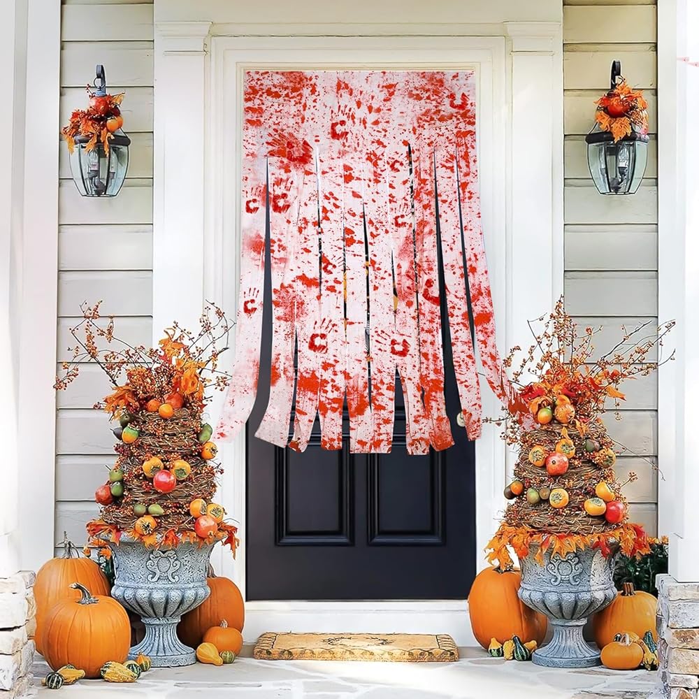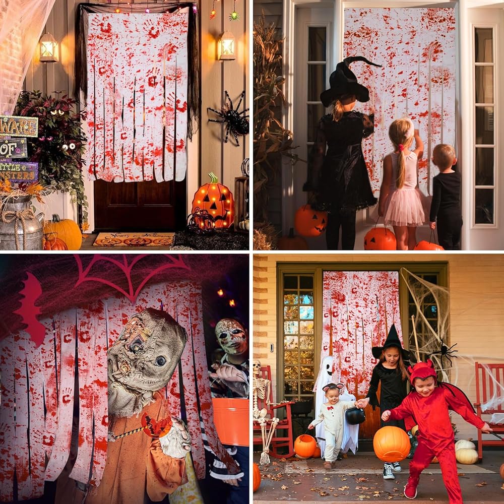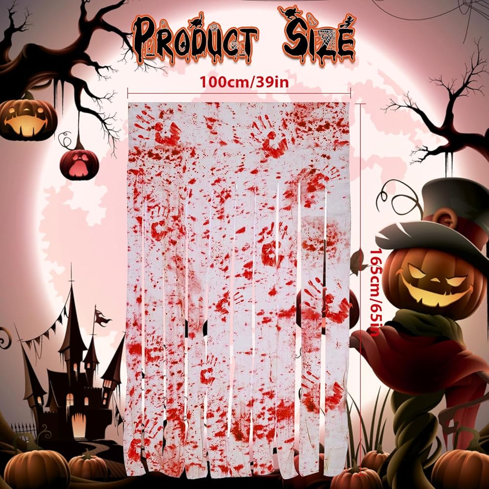 【Occasions】These Halloween decor are suitable for Halloween door, party, curtain, themed party, night party, haunted house and many other occasions. Make a quirky and horrible atmosphere for your parties. Blood-splattered gauze strips hang from a printed.