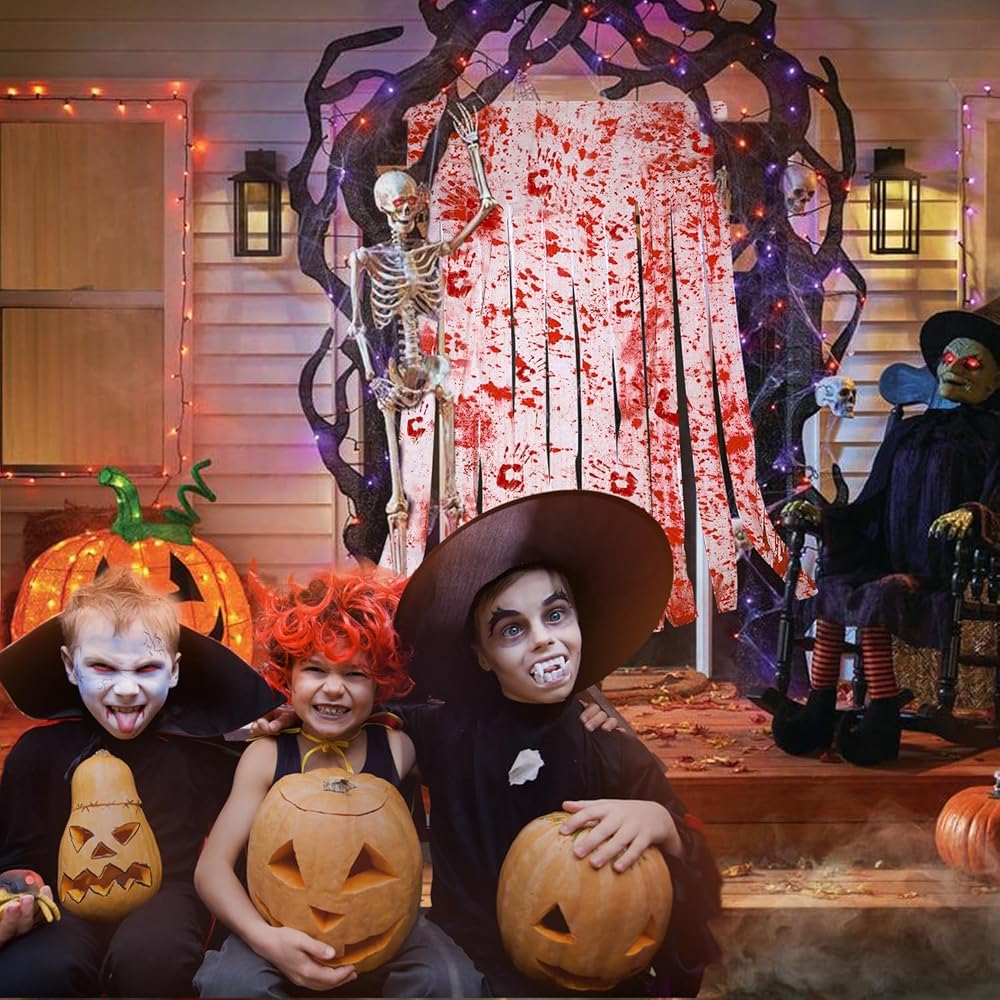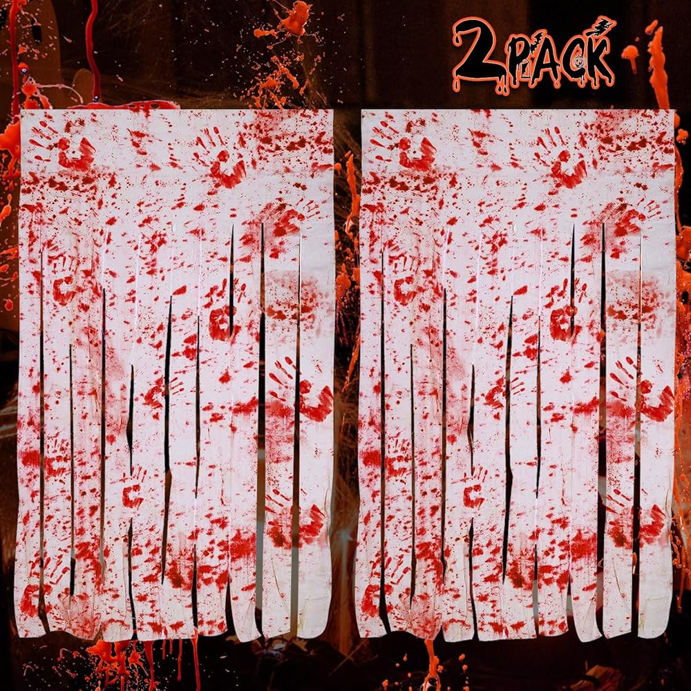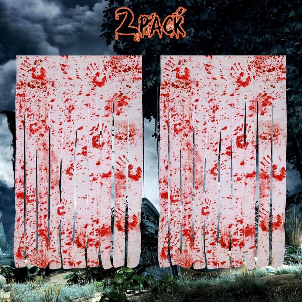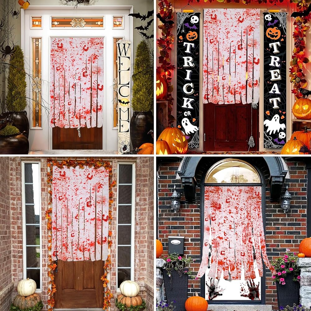 【Occasions】These Halloween decor are suitable for Halloween door, party, curtain, themed party, night party, haunted house and many other occasions. Make a quirky and horrible atmosphere for your parties. Blood-splattered gauze strips hang from a printed.