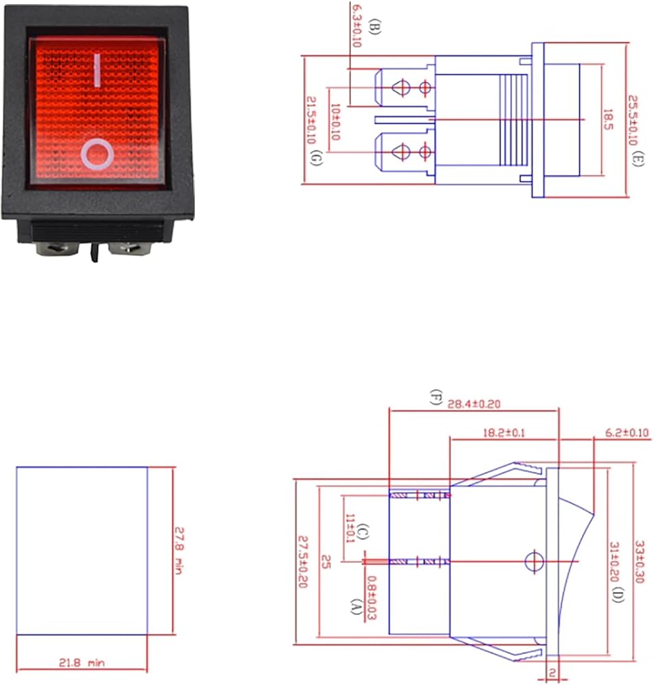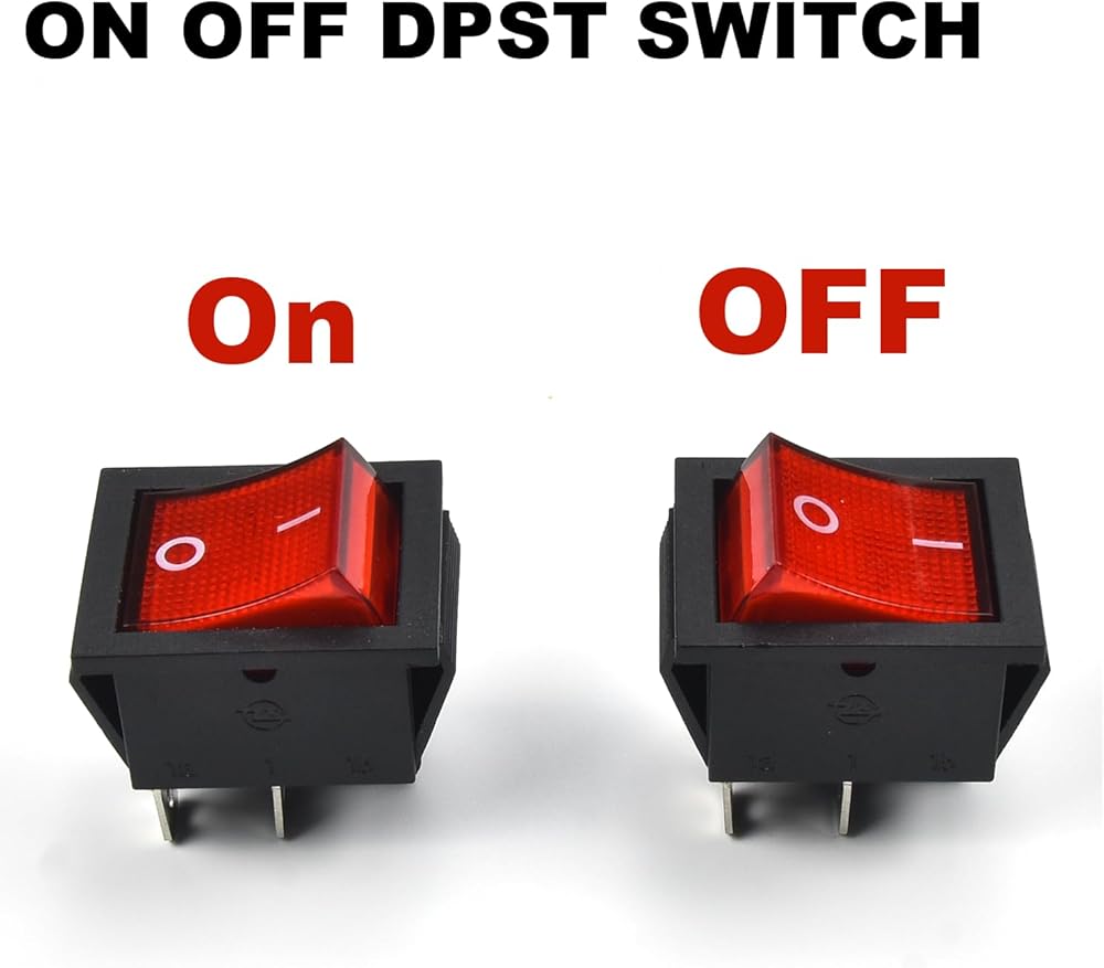 Set Includes: 2 red rocker switches, terminals: 4 pins; Position: 2 positions (ON-OFF), model: KCD4-201N