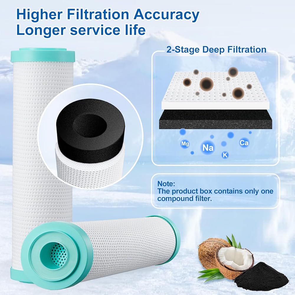 【ترشيح عميق على مرحلتين】: المكون الأساسي لنظام الفلتر هو مرشح مركب مقاس 10 بوصة. الطبقة الخارجية مصنوعة من مادة البولي بروبيلين عالية الدقة لإزالة ملوثات الجسيمات الكبيرة (الصدأ والرصاص والمعادن الثقيلة والشوائب الكيميائية والرمل). الطبقة الداخلية عبارة عن كتلة كربون منشط بقشرة جوز الهند عالية الامتصاص لتقليل الكلور والطعم والرائحة والفلورايد بشكل فعال. لذلك تضمن مياه أكثر أمانًا وأفضل مذاقًا من الصنبور والثلاجة وصانع الثلج.