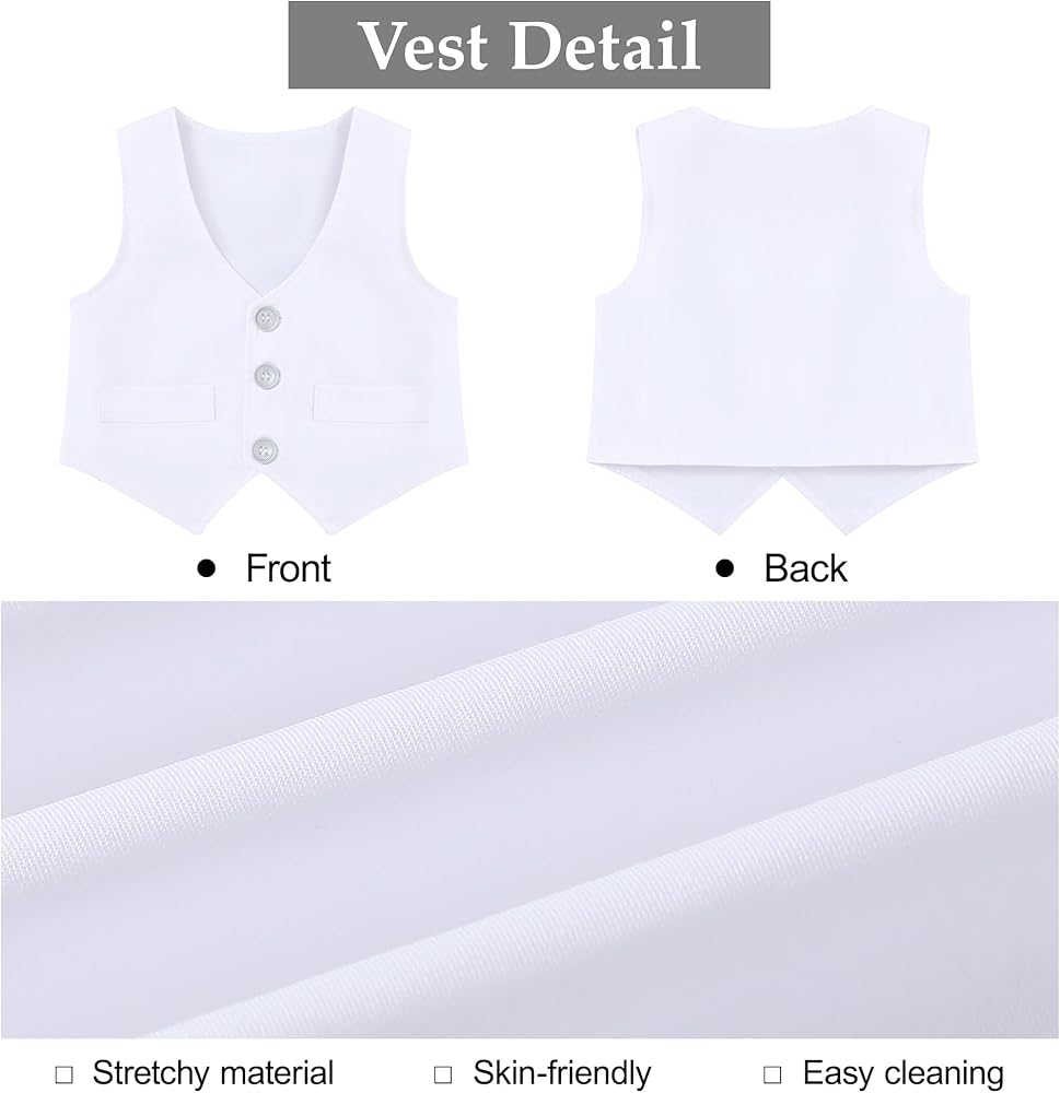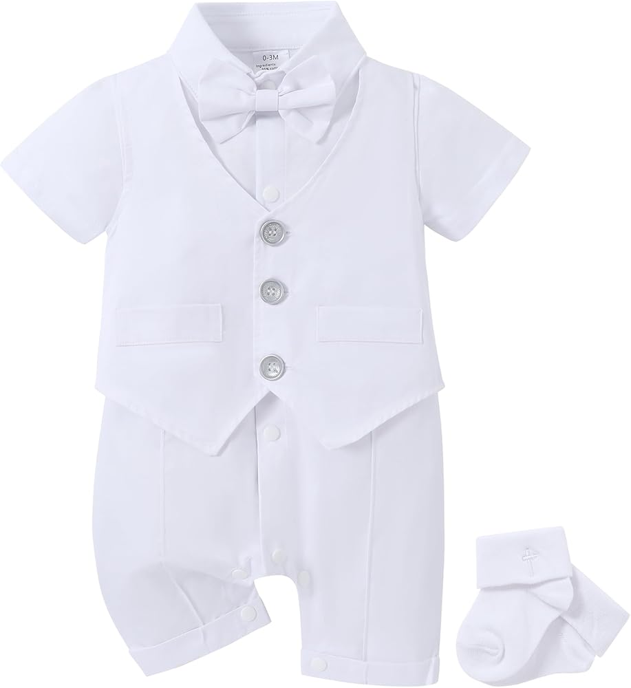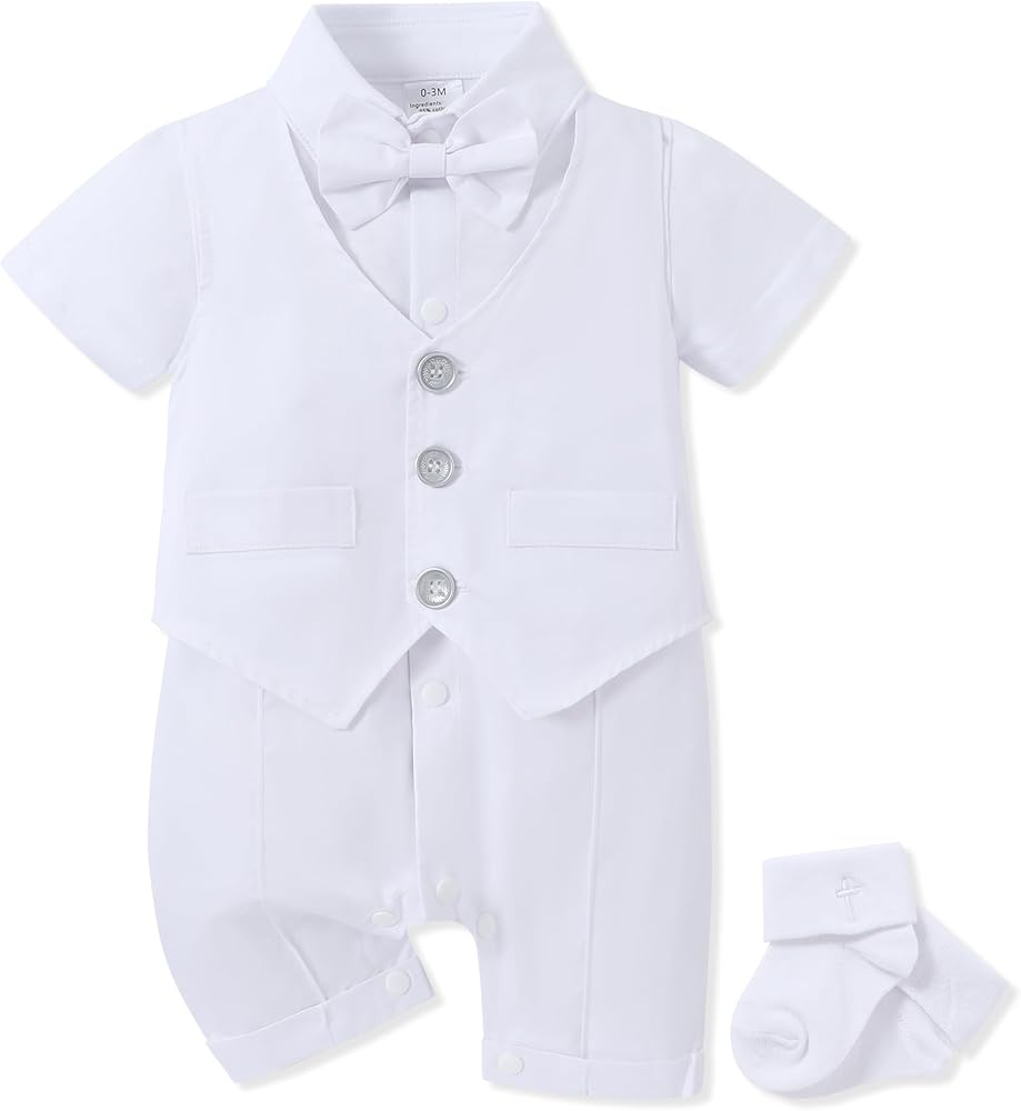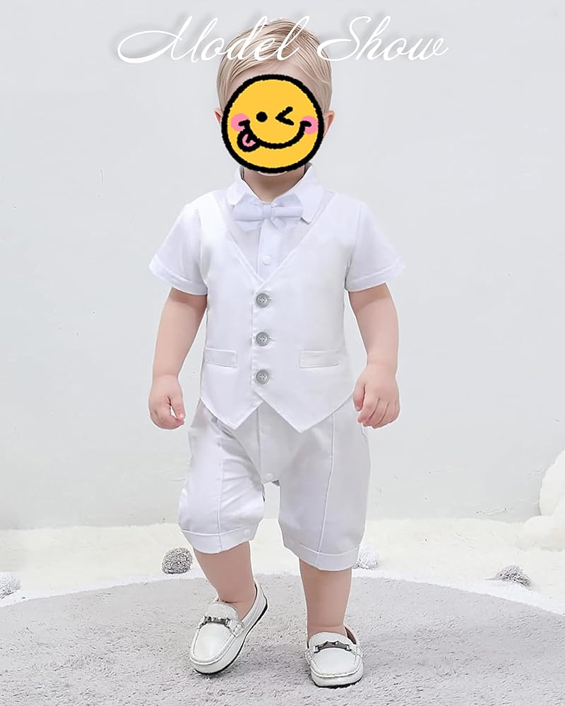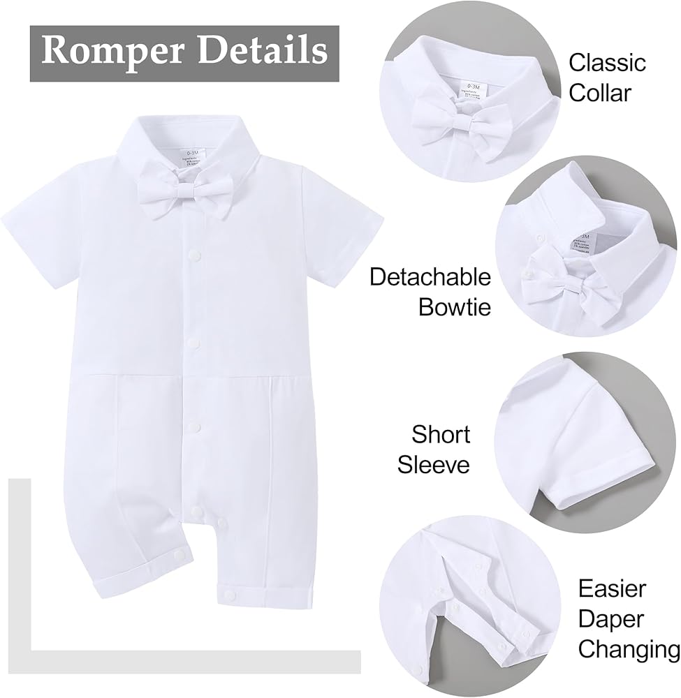 - التصميم: زي لطيف للرضع، ملابس تعميد للأولاد الصغار، مجموعة بدلة رسمية بيضاء للأولاد الصغار، رومبر صيفي أبيض بأكمام قصيرة مع ربطة عنق قابلة للإزالة، مما يجعله لطيفًا ورسميًا للغاية.