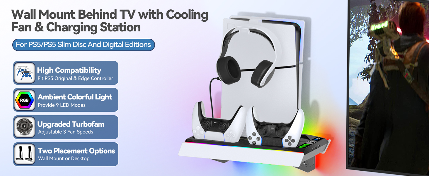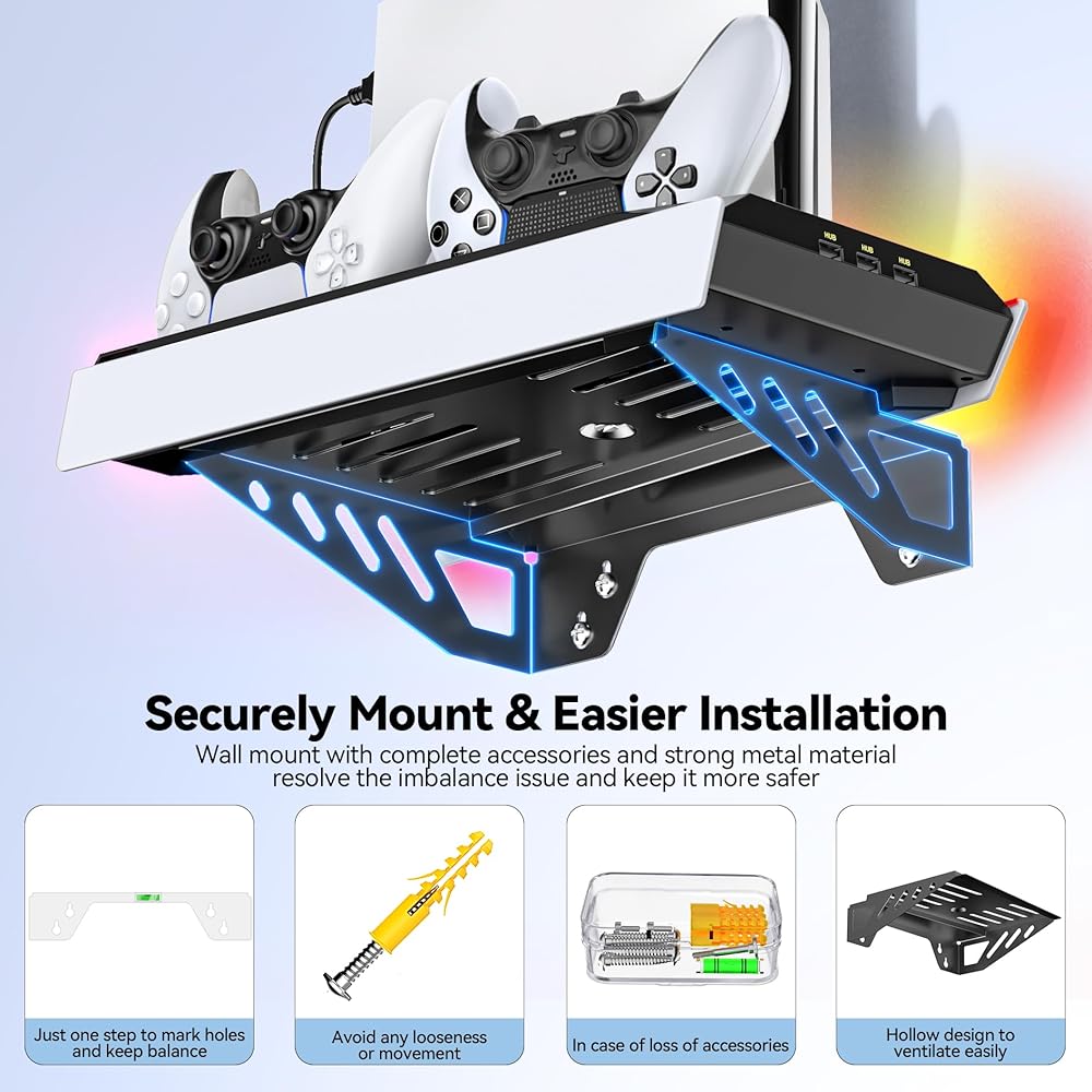 مجموعة أدوات التثبيت على الحائط لجهاز PS5 مع محطة شحن و9 مصابيح RGB لجهاز PS5 Edge ووحدة التحكم المزدوجة، ومحطة تبريد PS5 مع مروحة ثلاثية المستويات، وجدار حامل PS5 لأقراص PS5/PS5 النحيفة والرقمية، وحامل ملحقات PS5 على الرف