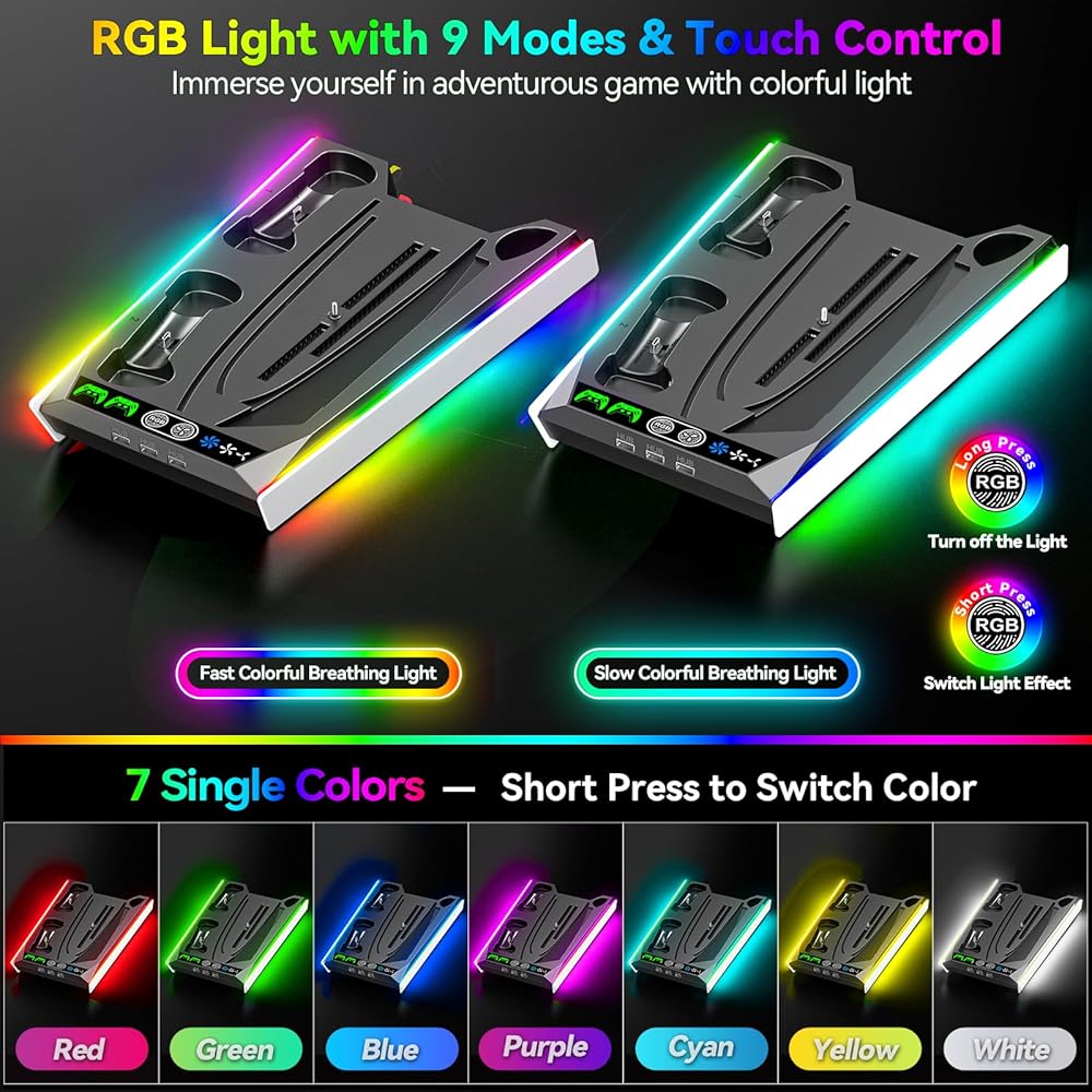 • 【9 أوضاع إضاءة RGB مع تحكم باللمس】تتميز محطة التبريد PS5 بإضاءة محيطة LED رائعة مع 9 أوضاع RGB والتي تحتوي على 7 أوضاع ألوان فردية بالإضافة إلى وضعين سريع/بطيء للتنفس متعدد الألوان. يحتوي حامل الحائط PS5 على تحكم باللمس RGB ووظيفة الذاكرة التي يمكنها دعم تبديل الألوان للضغط القصير، وإطفاء الضوء للضغط لفترة طويلة بحيث يمكنه الاحتفاظ بآخر لون مستخدم. رف الحائط PS5 المزود بإضاءة RGB ملفت للنظر ويخلق جوًا مفعمًا بالحيوية لغرفة الألعاب الخاصة بك.
