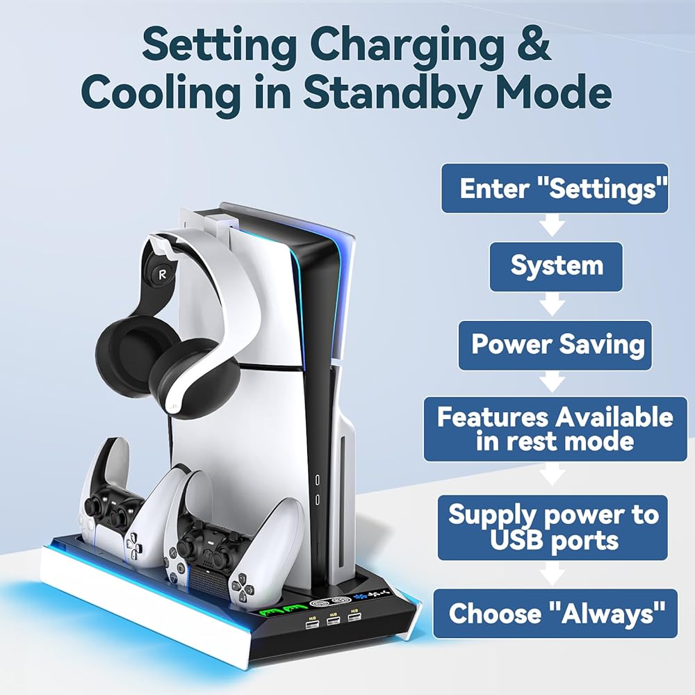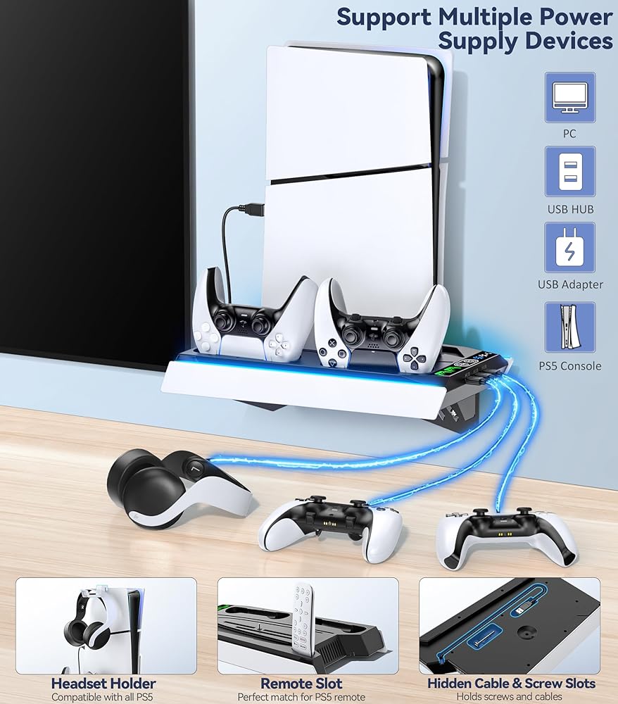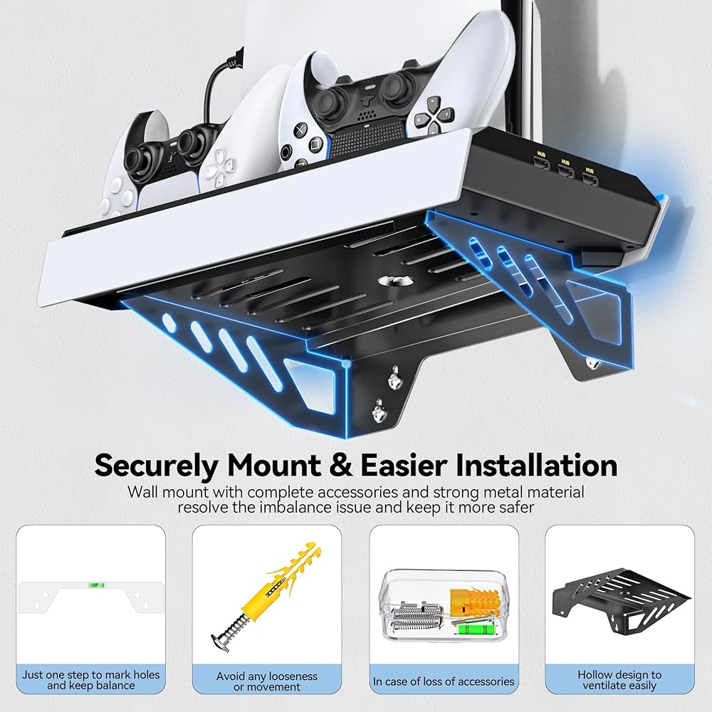 • 【متوافق مع جميع وحدات تحكم PS5 ووحدات تحكم PS5】تم تصميم مجموعة التثبيت على الحائط PS5 مع الشحن لتعليق قرص PS5 وPS5 النحيف والإصدار الرقمي على الحائط أثناء شحن وحدات تحكم PS5 الأصلية وEdge في نفس الوقت. يحمل حامل PS5 بشكل آمن وحدة تحكم PS5 ووحدتي تحكم PS5 وسماعة الرأس على حامل جداري واحد، مما يجعله حلاً مثاليًا لتوفير المساحة. تم تصميم حامل PS5 النحيف الخاص بنا حصريًا في هذا السوق لدعم جميع ملحقات PS5 التي تمت ترقيتها.