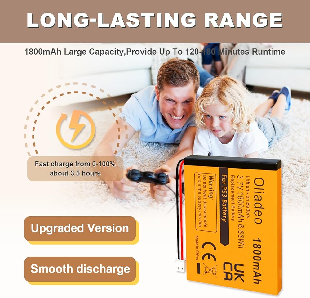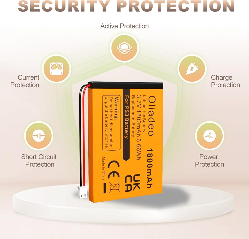 حماية السلامة: بطارية بديلة PS3 مدمجة في شريحة ذكية، تمنع الشحن الزائد، والتفريغ الزائد، وارتفاع درجة الحرارة وحماية متعددة للدوائر القصيرة، لضمان سلامة شحن البطارية، وتحسين عمر البطارية.