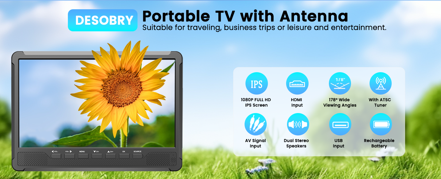 تلفزيون صغير ديسوبري 10.6 بوصة، تلفزيون محمول 1080 بكسل مع هوائي قابل للفصل، تلفزيون صغير مع شاشة IPS، تلفزيون يعمل ببطارية قابلة لإعادة الشحن يدعم HDMI، USB، AV، موالف رقمي مدمج، حامل تلفزيون، مكبرات صوت مزدوجة