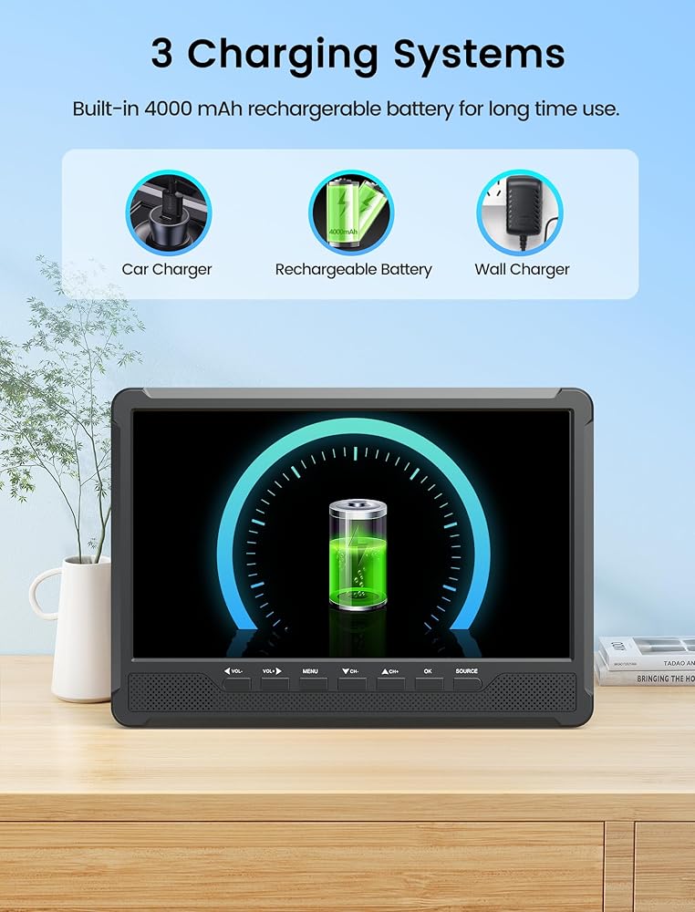 • ☀ [خيارات طاقة متعددة]] يحتوي هذا التلفزيون الصغير على بطارية مدمجة قابلة لإعادة الشحن، مما يجعل من السهل مشاهدة برامجك التلفزيونية المفضلة في رحلات الطريق أو في الفناء أو أثناء انقطاع التيار الكهربائي. يأتي مع شاحن سيارة أو شاحن حائط لتلبية احتياجاتك المختلفة، ويمكنك شحن التلفزيون الذي يعمل بالبطارية في السيارة أو في المنزل.