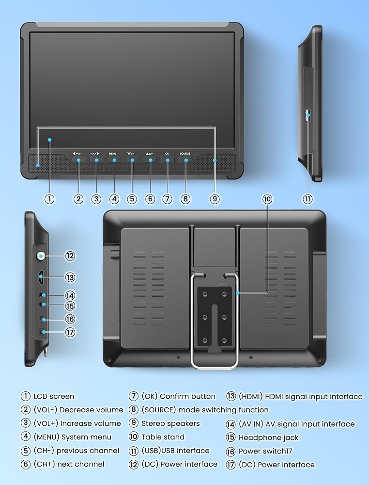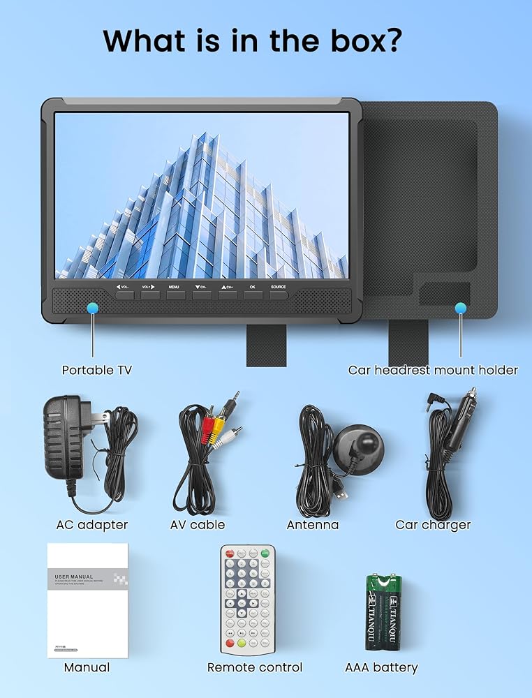 • ☀ 【تلفزيون صغير مع حامل】يحتوي التلفزيون الصغير على حامل سطح مكتب مدمج، مما يلغي الحاجة إلى التركيب والتفكيك وهو مريح جدًا في الاستخدام. يمكنك ضبط الحامل على زاوية مناسبة لمشاهدة أفلامك المفضلة أو مباريات كرة القدم في وضعية جلوس مريحة. عند ركوب السيارة، يمكنك استخدام دعامة مسند الرأس المتضمنة في العبوة لتثبيت التلفاز الصغير المحمول على المقعد لتقليل التعب الناتج عن ركوب السيارة.