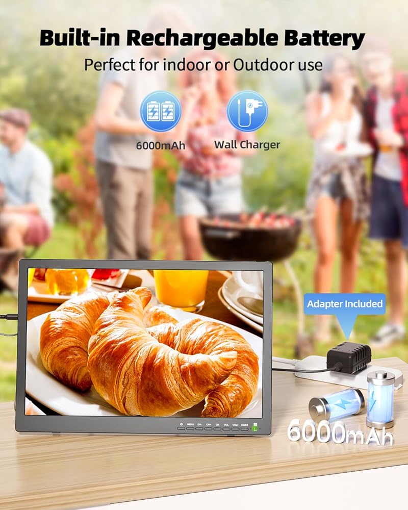 【تلفزيون يعمل ببطارية قابلة لإعادة الشحن】لا تقلق أبدًا بشأن انقطاع الطاقة فجأة بفضل التلفزيون المحمول المزود بهوائي مدمج ببطارية قابلة لإعادة الشحن بقدرة 6000 مللي أمبير في الساعة، فلن تحتاج إلى شحنها طوال الوقت أو استخدام بطاريات AA للاستخدام.