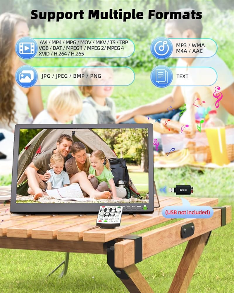 【تنسيقات متعددة متوافقة】منفذ USB المدمج في التلفزيون الذكي المحمول، يدعم تشغيل MP4، AVI، MPG، MOV، MKV، TS، TRP، VOB، DAT، MPEG 1، MPEG 2، MPEG 4، XVID، H.264، H.265، MP3، WMA، M4A، AAC، JPG، JPEG، BMP، PNG، نص. يدعم تلفزيوننا المحمول كلاً من FAT32 وNTFS(HDD).