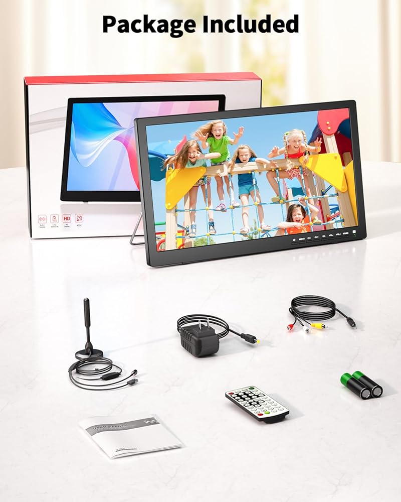 تلفزيون ديسوبري 17 بوصة محمول مع هوائي، تلفزيون صغير محمول مع موالف ATSC، شاشة تلفزيون محمولة تعمل بالبطارية، حامل تلفزيون مدمج، تلفزيون صغير لغرفة النوم، المطبخ، التخييم، RV، دعم HDMI، AV، USB