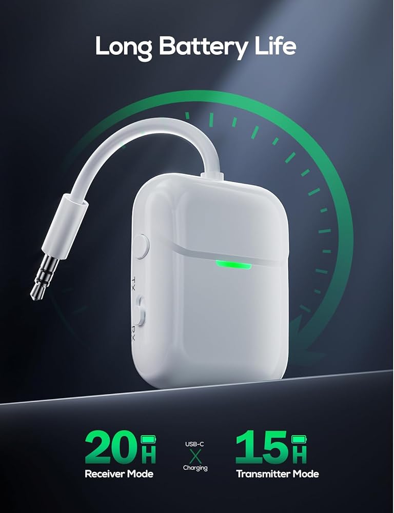 أداء البطارية الممتد: توفر ما يصل إلى 20 ساعة في وضع الاستقبال و15 ساعة في وضع الإرسال، مما يضمن أداء طويل الأمد للاستخدام الممتد. يمكنك إعادة الشحن بسرعة باستخدام كابل Type-C المرفق، حتى تتمكن من الاستمرار في الاستمتاع بالموسيقى والمكالمات.