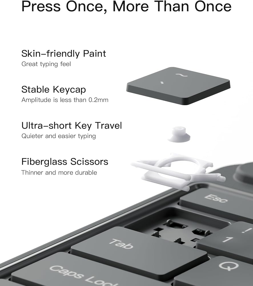 • العمل المكتبي الفعال: تتميز لوحة المفاتيح السطحية Inateck بهيكل مقص وضغطة مفاتيح قصيرة للغاية، وتوفر لوحة المفاتيح هذه تجربة كتابة سلسة ومريحة حتى أثناء الاستخدام الطويل.