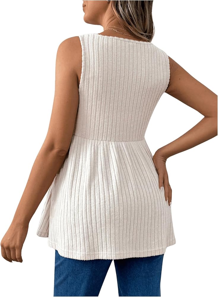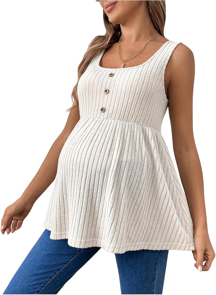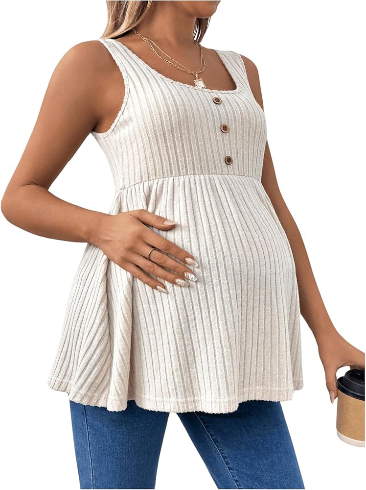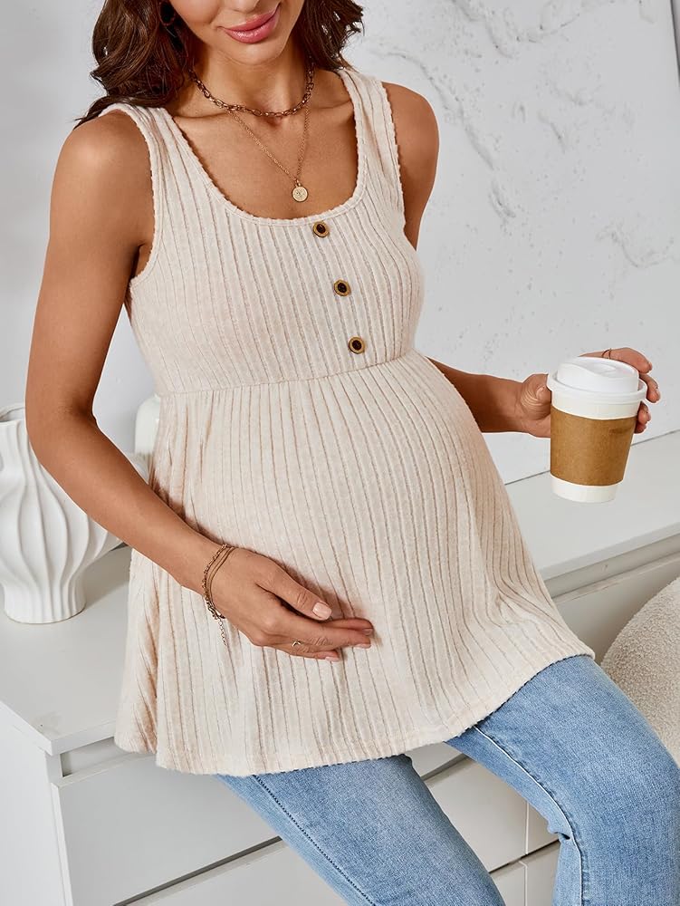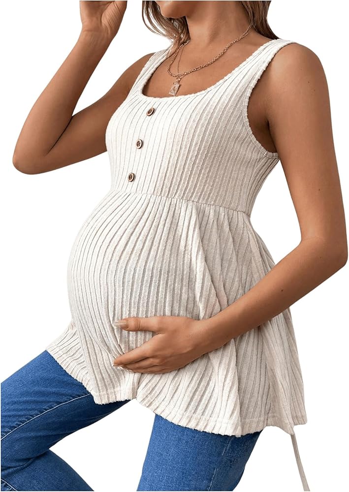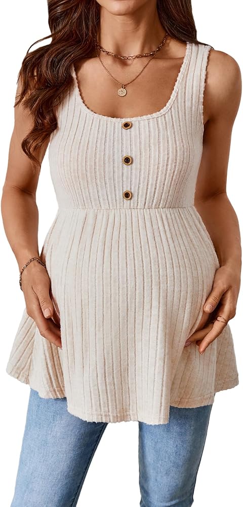 • Feature: Scoop neck, rib knit, ruffle hem, button, flared maternity tank top