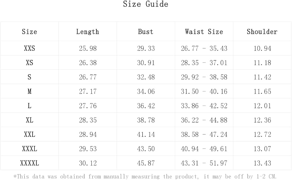 XXL:Bust:41.1IN,Length:28.9IN,Shoulder:12.7IN,Waist Size:38.6-47.2IN