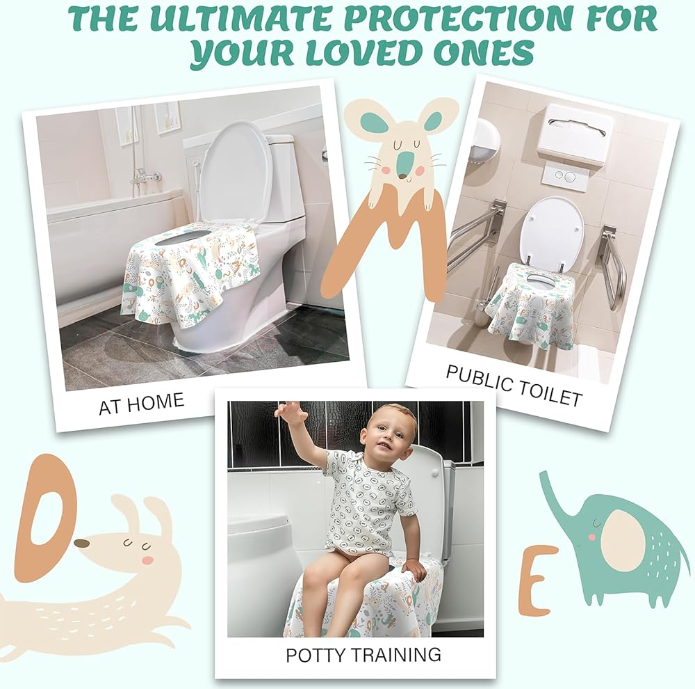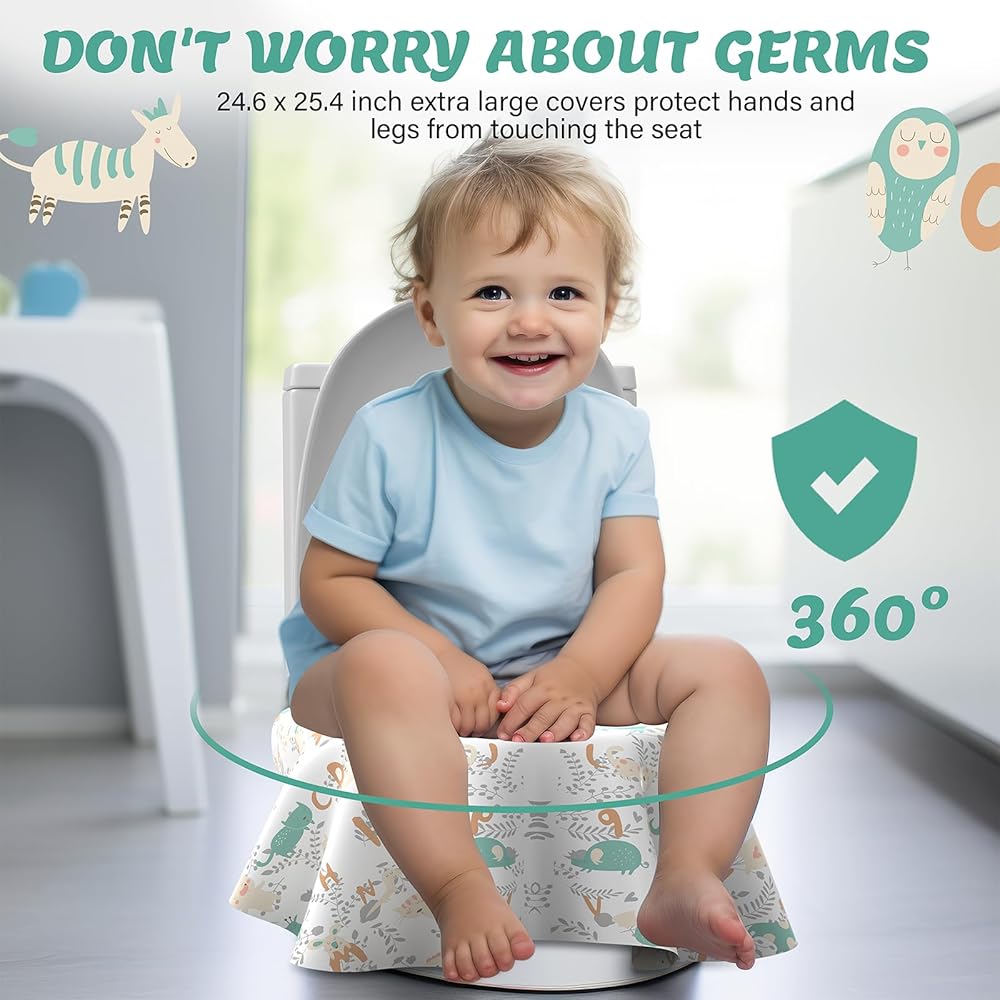 【احم طفلك من الفوضى】أغطية مقاعد المرحاض التي تستخدم لمرة واحدة مقاس 24.6 × 25.4 بوصة كبيرة جدًا لتغطية مقعد المرحاض بالكامل ولضمان حماية بشرتك وملابسك أنت وأحبائك من أي فوضى في مقعد المرحاض. سهل الإعداد وسهل التخلص منه لجميع الأطفال الصغار والأولاد والبنات وحتى البالغين.