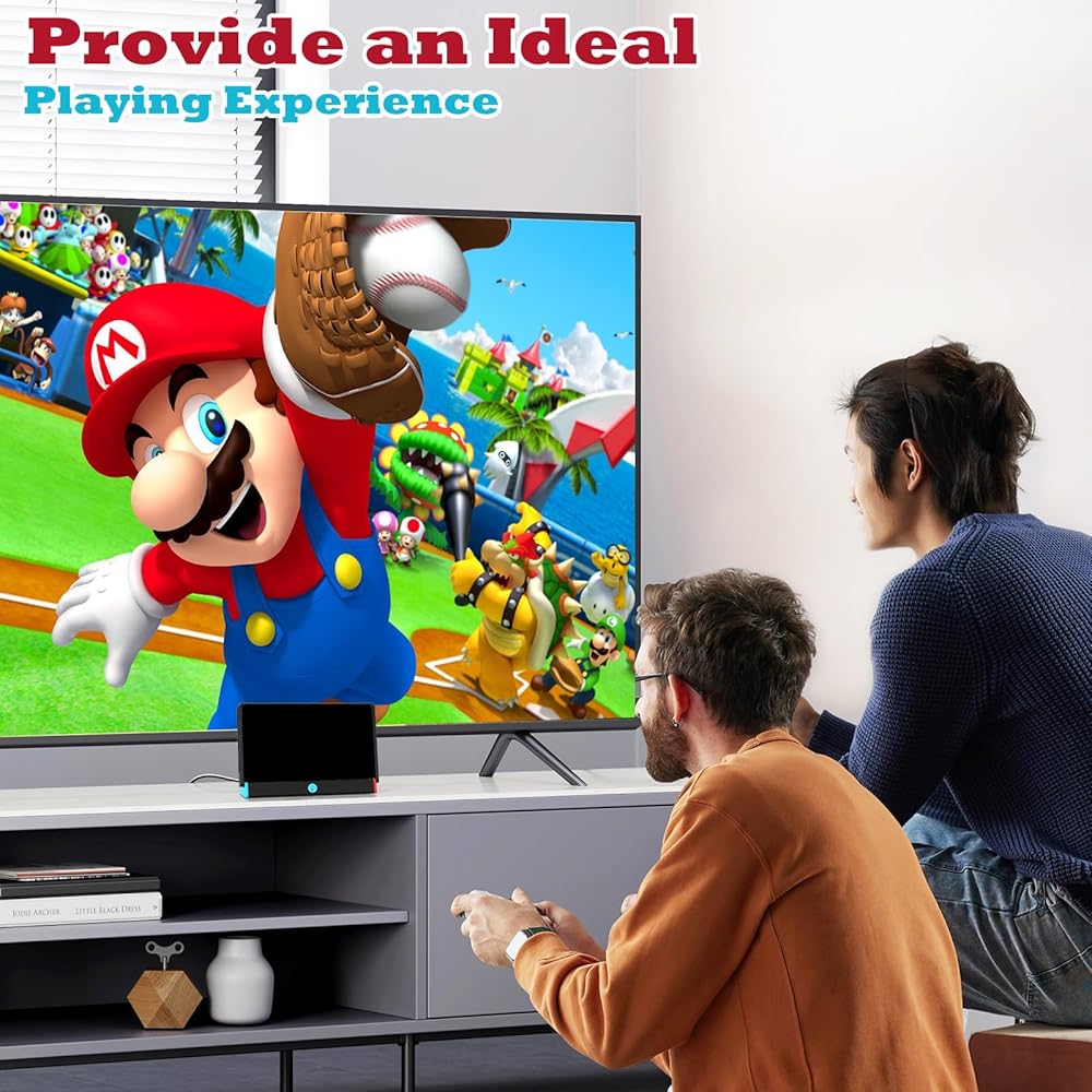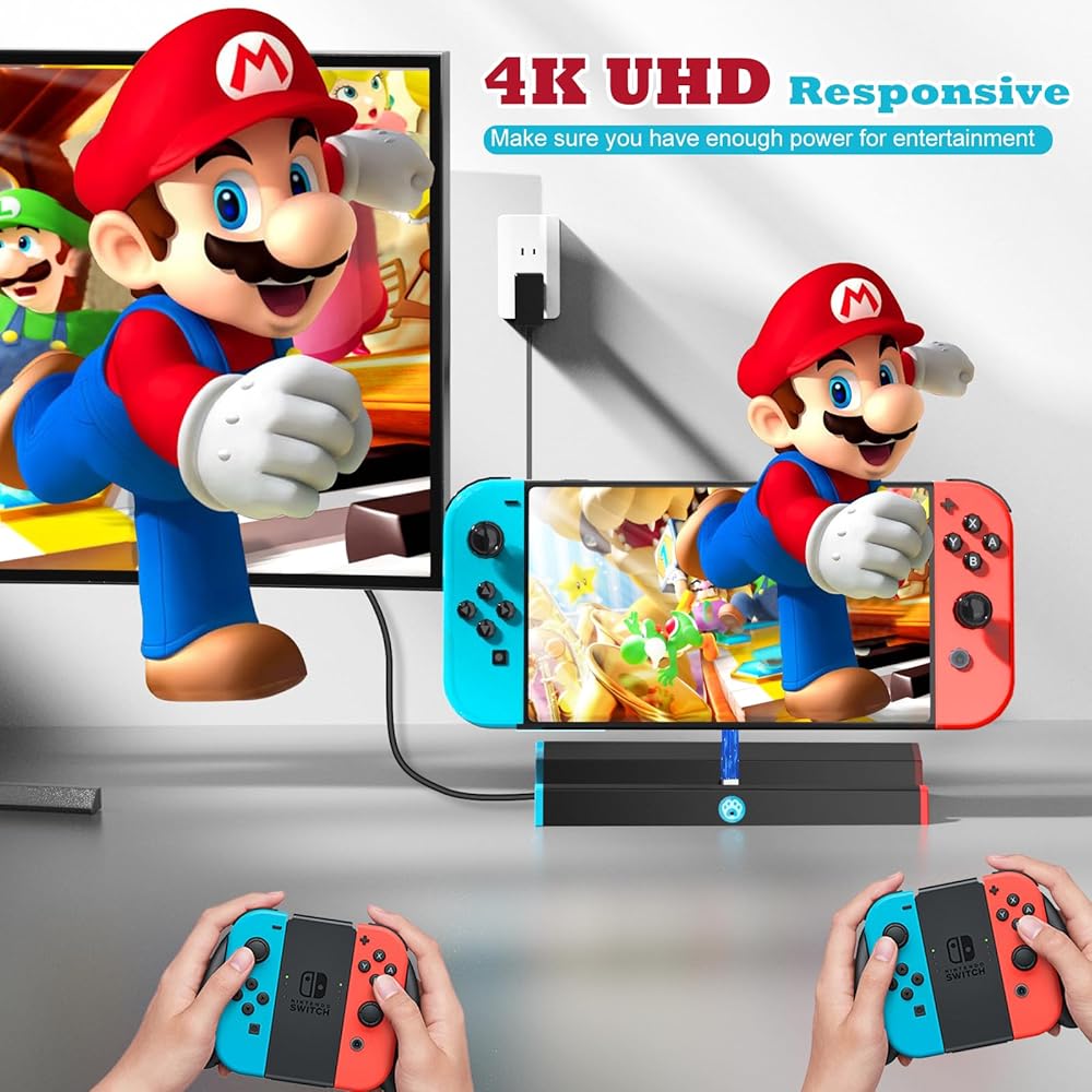 【مخرج فيديو عالي الدقة】: يمكنك الاستمتاع بالترفيه الغامر بوضوح مذهل. تدعم قاعدة الشحن سويتش للتلفزيون إخراج فائق الوضوح بدقة 4 كيه عند 60 هرتز، مما يسمح لك بالاستمتاع بتجربة لعب ومشاهدة جذابة بصريًا. (ملاحظة: لا يعمل Switch lite بشكل صحيح مع نفس وظيفة الشاشة)