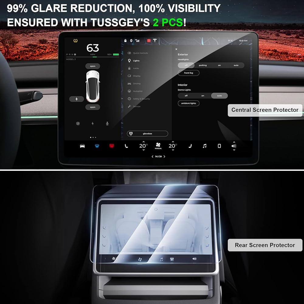 ✅【OEM1:1 تصميم تغطية دقيقة مثالية لـ TESLA】مصمم خصيصًا لموديل Tesla Y/3، اعتمدت Tussgey بشكل خاص تقنية المسح الضوئي ثلاثية الأبعاد للسيارة الأصلية، مما يجعل واقي الشاشة هذا مناسبًا تمامًا لموديل Tesla Y/3، مما يضمن سلاسة ملائم من الحافة إلى الحافة، ويغطي الشاشة بأكملها بشكل مثالي. علاوة على ذلك، فإنه سيوفر الحماية الكاملة لشاشتك مثل درع قوي مع الحفاظ على المظهر الحديث لسيارة Tesla الخاصة بك، وهو بالتأكيد أمر لا بد منه مثل ملحقات Tesla Model Y/3 2024. (🚫نصائح: ليس للطراز 3 Highland 2024)