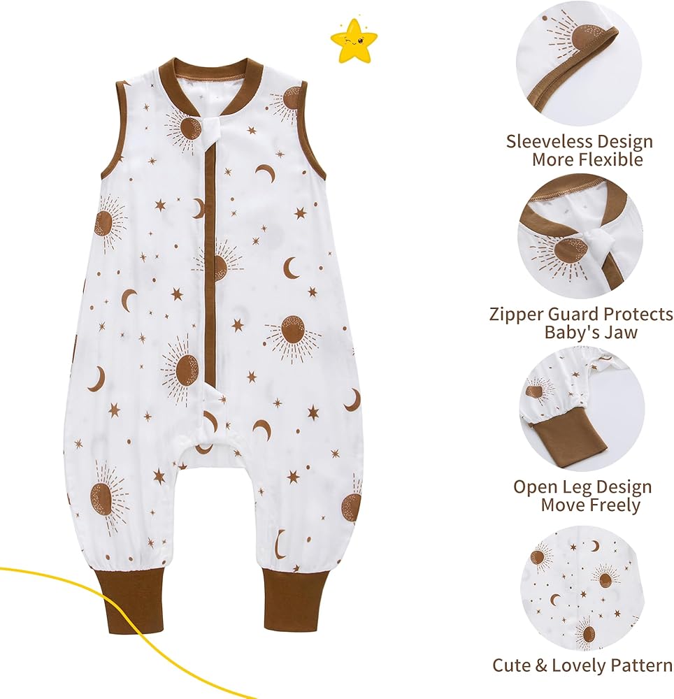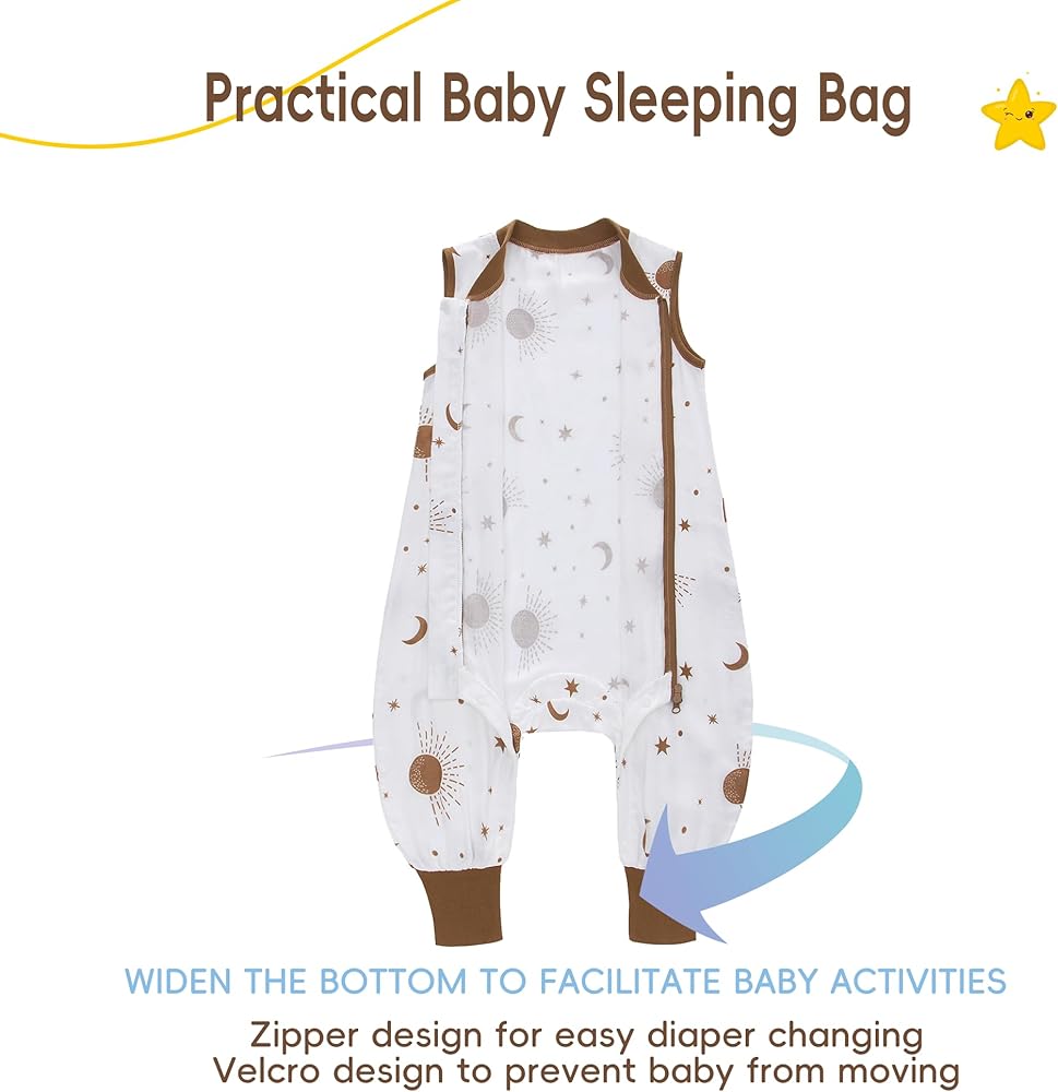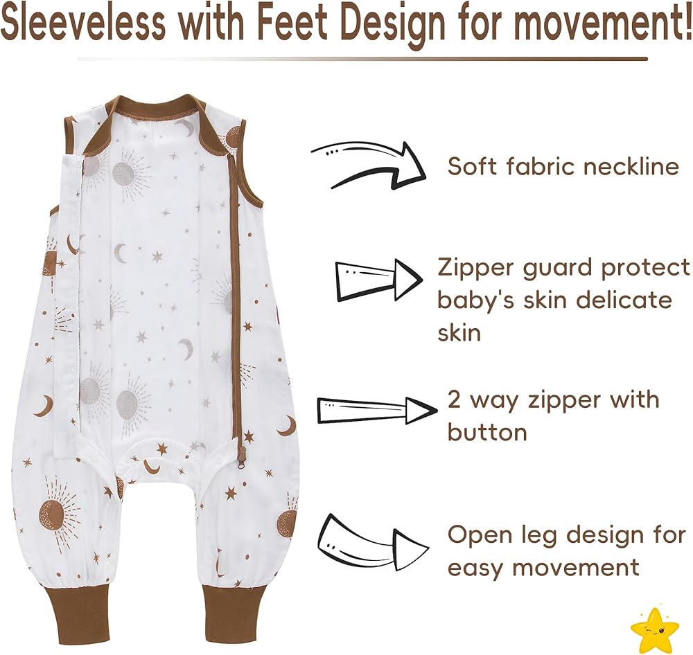 • مساحة كبيرة: توفر حقيبة النوم المريحة وخفيفة الوزن مساحة واسعة لطفلك للتحرك والركل، مع الحفاظ على دفء وأمان. كما تسمح فتحات القدم بحركة مريحة عندما يستيقظ طفلك