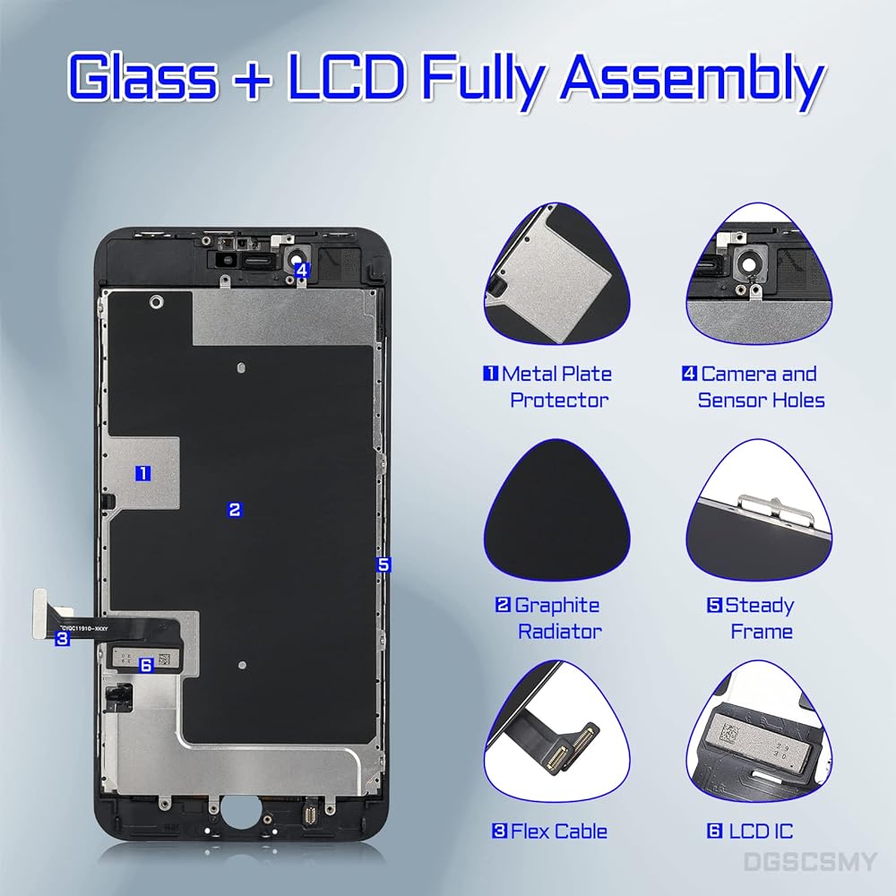 【يرجى ملاحظة: تم تجميع شاشة iPhone8 plus مسبقًا بلوحة معدنية مع مادة تبديد الحرارة من الجرافيت. بالإضافة إلى ذلك، يجب نقل سماعة الأذن والكاميرا الأمامية ومكبر الصوت ومستشعر القرب وزر الصفحة الرئيسية من شاشتك الأصلية إلى هذه الشاشة الجديدة والاحتفاظ بجميع الوظائف. نصائح التثبيت: قم بإيقاف تشغيل الهاتف قبل استبدال الشاشة؛ قم بتوصيل وفصل البطارية المرنة أولاً للتخلص من المشكلات غير الطبيعية؛ استخدم مجفف الشعر لتنعيم الغراء وتسهيل إزالة الشاشة.