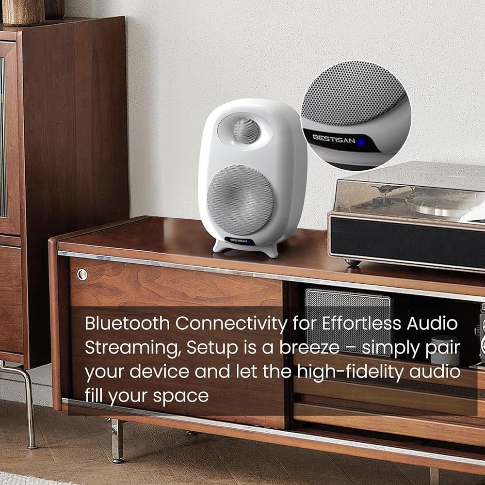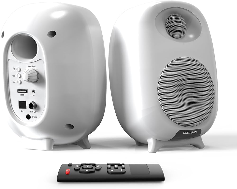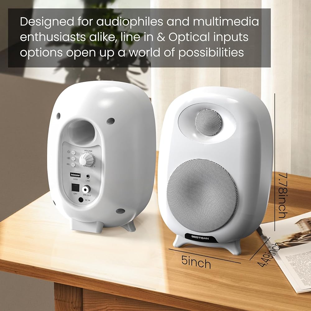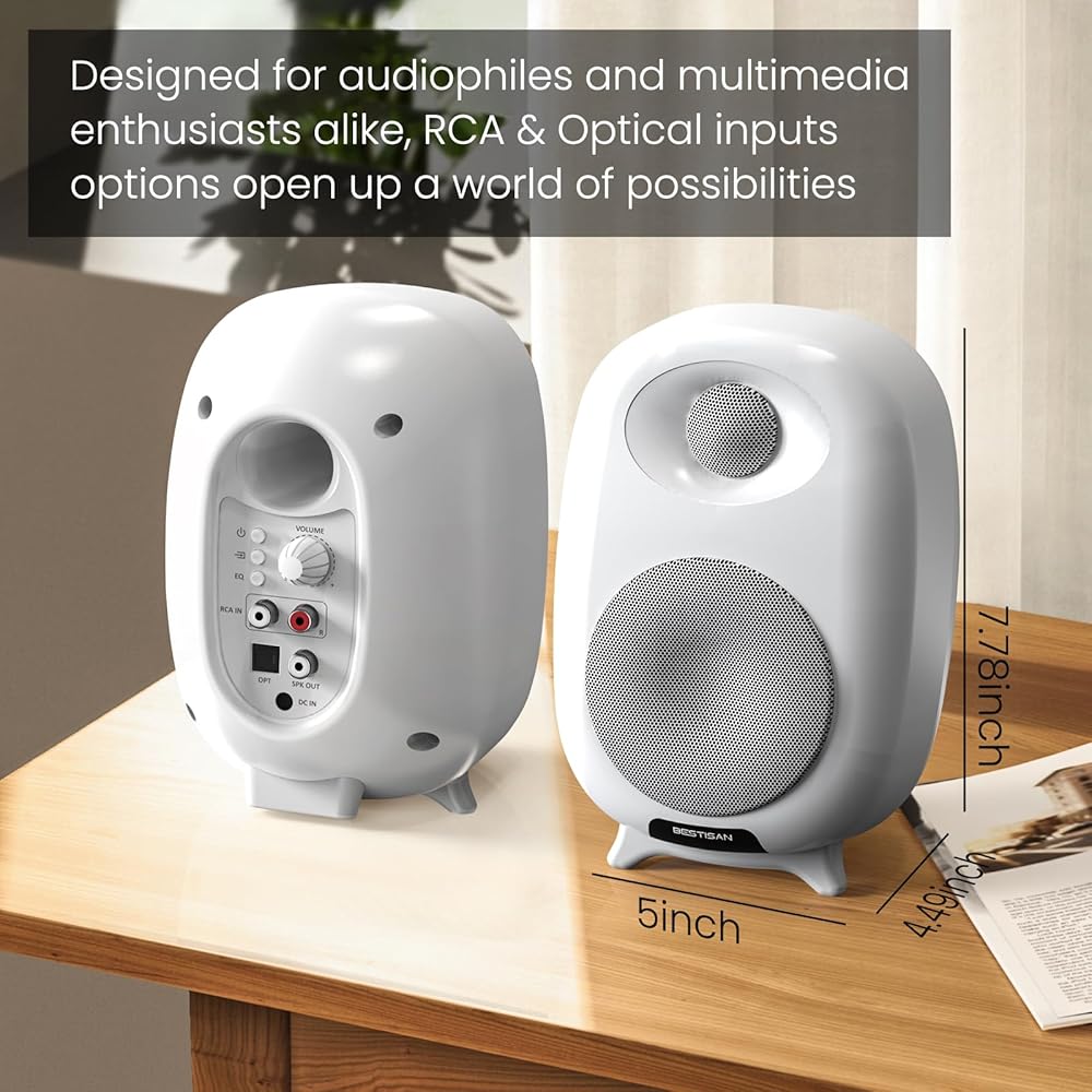مكبرات صوت بلوتوث BESTISAN SR06 على رف الكتب للأقراص الدوارة، وأجهزة الكمبيوتر المكتبية مع مكبر صوت 3 بوصة، ومكبرات صوت تلفزيون مع مدخلات بصرية/RCA (أبيض، زوج، 50 وات)