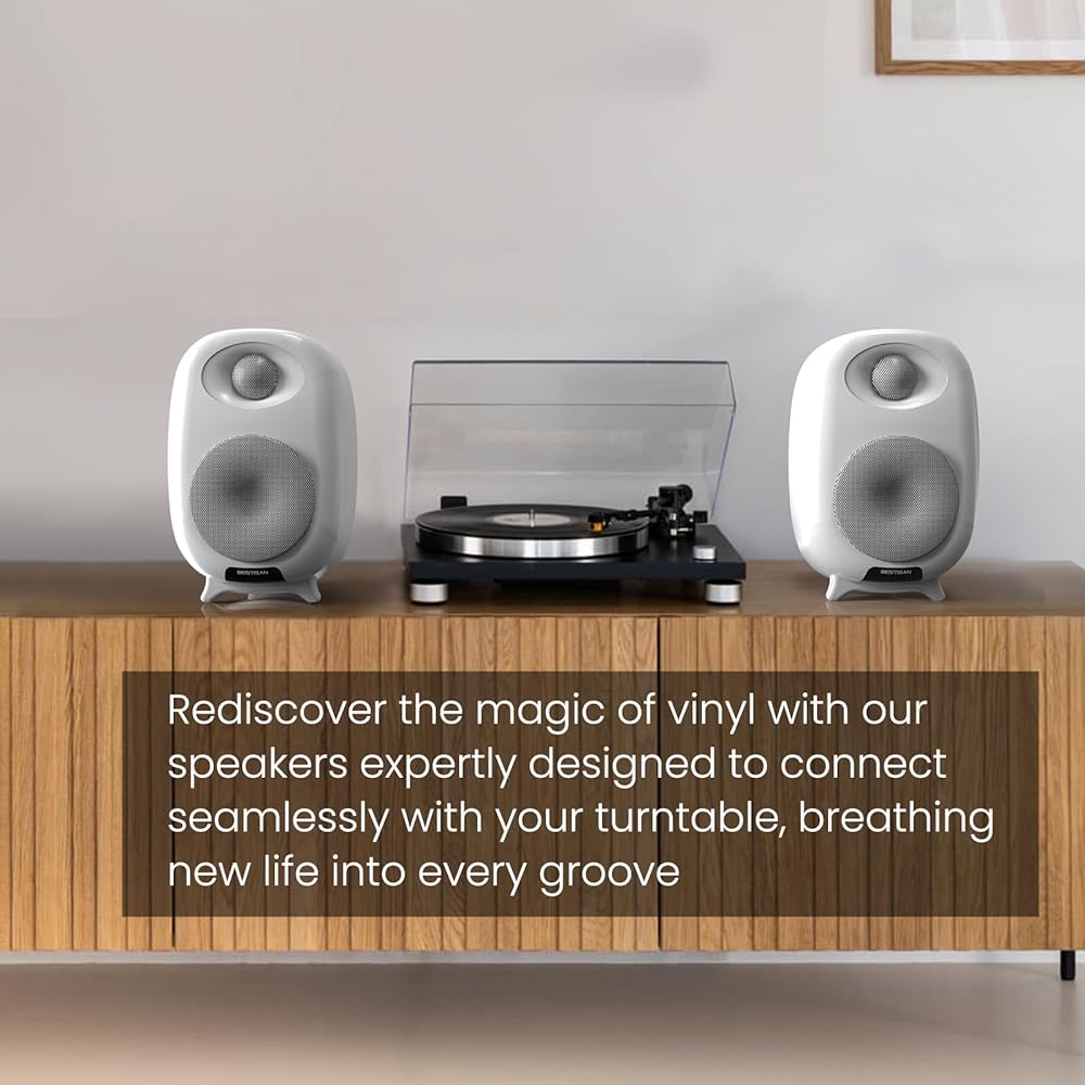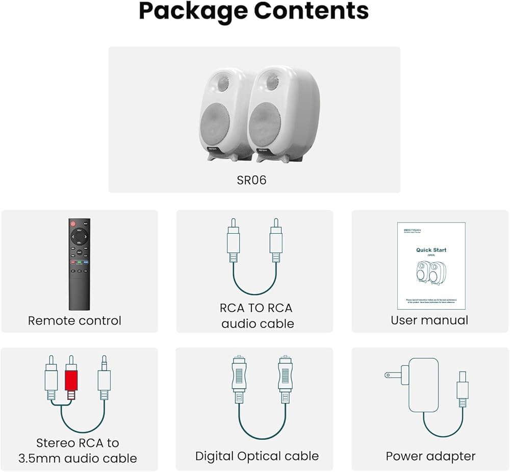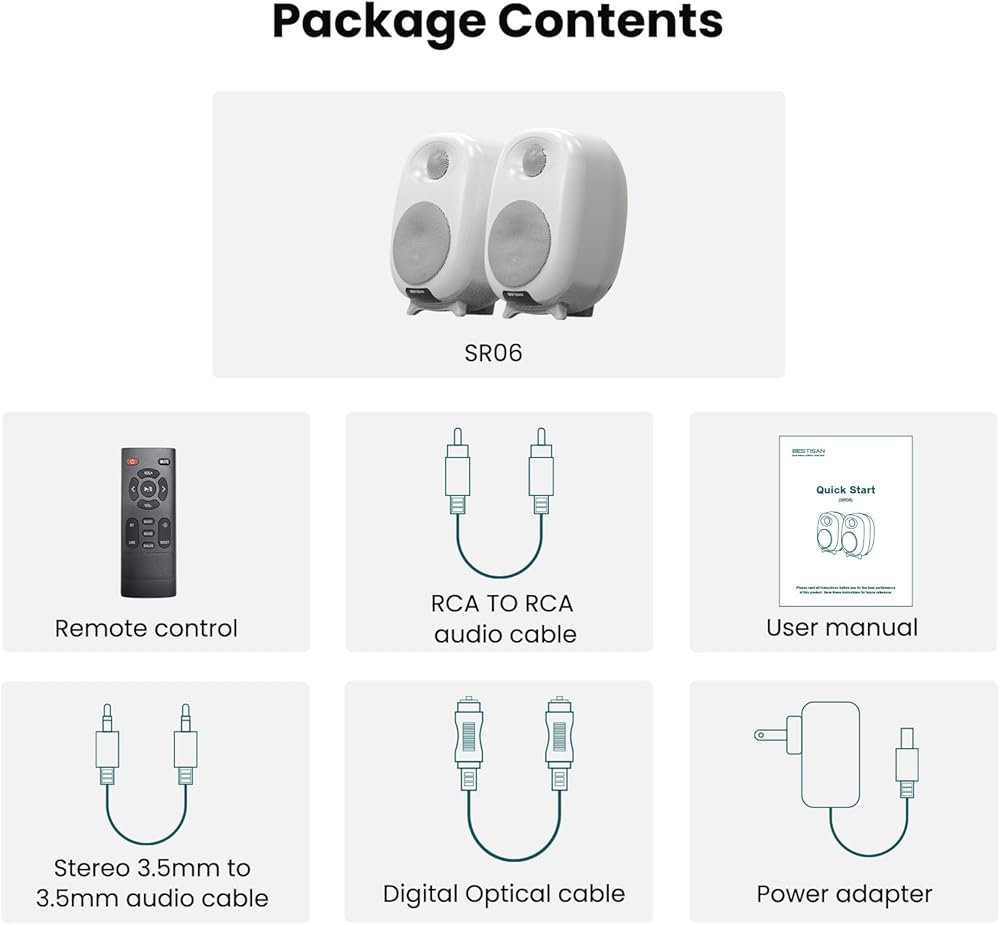 مكبرات صوت بلوتوث BESTISAN SR06 على رف الكتب للأقراص الدوارة، وأجهزة الكمبيوتر المكتبية مع مكبر صوت 3 بوصة، ومكبرات صوت تلفزيون مع مدخلات بصرية/RCA (أبيض، زوج، 50 وات)