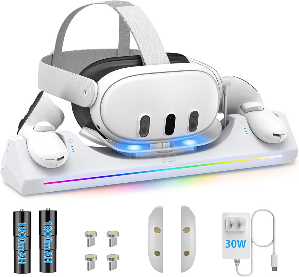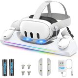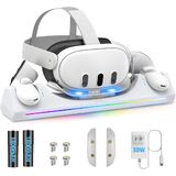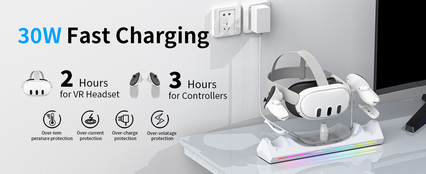 [شحن سريع 3 في 1] تدعم قاعدة الشحن كويست 3 الشحن السريع بقدرة 30 وات، والذي يمكنه شحن سماعة الرأس بالكامل خلال 2-3 ساعات تقريبًا ووحدة التحكم في حوالي 3-4 ساعات. يوفر حامل الشحن Quest 3 حماية من الجهد الزائد، وحماية من الجهد المنخفض، وحماية من الحمل الزائد، وحماية من ماس كهربائى لتوفير شحن مستقر وآمن لسماعات الواقع الافتراضي وأجهزة التحكم التي تعمل باللمس.