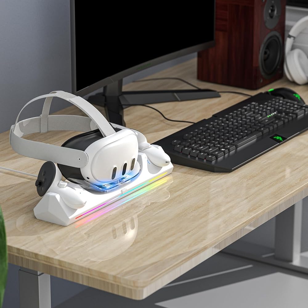 【أضواء ROG متعددة الألوان】قاعدة الشحن Oculus Quest 3 هي أروع ملحقات Quest 3 وأكثرها أناقة، مع زر منفصل لتشغيل وإيقاف أضواء ROG بسهولة. يكون مؤشر LED باللون الأزرق عند الشحن ويتغير الرمز من الأحمر إلى الأخضر عند الشحن بالكامل.