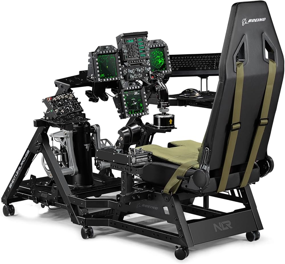 Introducing the Next Level Racing Flight Seat Pro Boeing Military Edition, officially licensed Boeing product and tailored for a broad spectrum of flight enthusiasts. This premium seat features a wide frame for enhanced stability, a center HOTAS mounting pole with adjustable height and angle, and compatibility with major brands like Thrustmaster, VPC Mongoos, and WINWING. For extended comfort during long sessions, it includes a safety footstep, lumbar cushion, seat harness, and various flight plates for diverse throttle and HOTAS setups. Designed for ergonomic support in helicopter and space configurations, and equipped with lockable castor wheels for easy mobility, the Flight Seat Pro Boeing Military Edition is the perfect choice for both professionals and enthusiasts seeking a truly immersive flying experience. Combine the Flight Seat Pro with the Next Level Racing Flight Stand Pro.