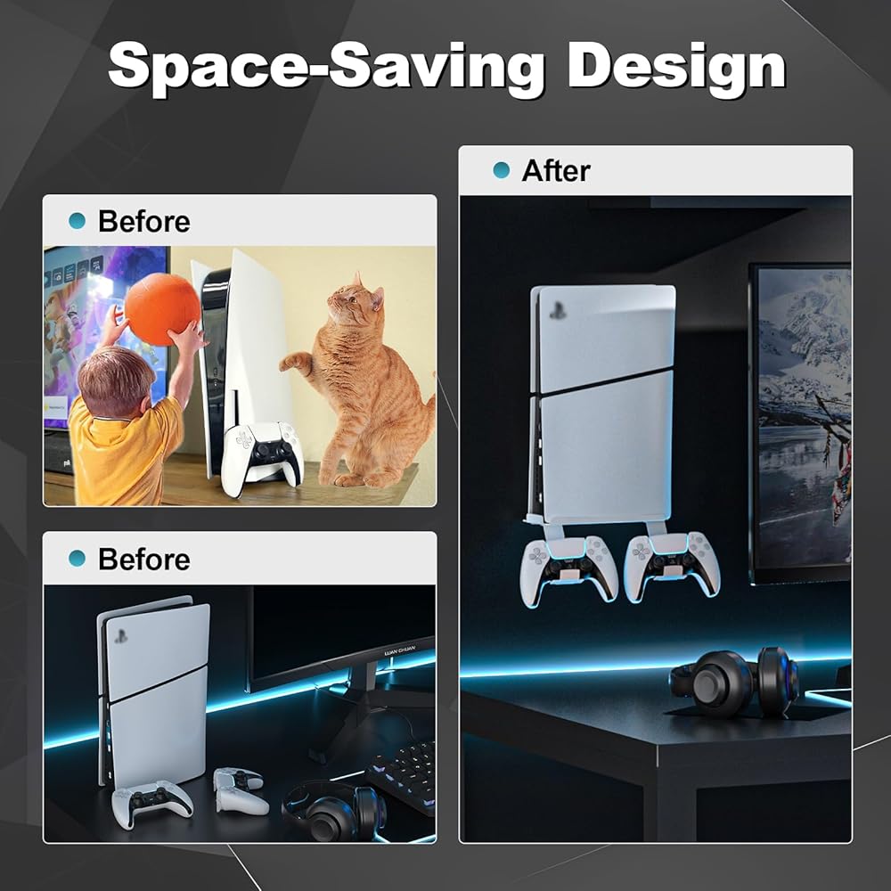 تصميم موفر للمساحة: قم بتركيب جهاز PS5 الخاص بك بجوار التلفزيون أو خلفه، واحتفظ بجميع الكابلات مخفية خلف وحدة التحكم، وحرر مساحة قيمة في مركز الترفيه أو المكتب الخاص بك عن طريق تثبيت جهاز PS5 الخاص بك بشكل آمن على الحائط أو المكتب أو مركز الترفيه أو أي مكان ترغب فيه ضعها واحمي ملحقات ps5 الخاصة بك من التعرض للتلف بسبب السقوط وبعيدًا عن متناول الأطفال أو الحيوانات الأليفة.